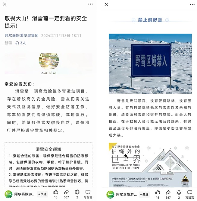 阿勒泰新闻网-阿勒泰地区融媒体中心(实习记者 王景鸿)11月18日,阿尔泰旅游发展集团发布安全提示,呼吁广大雪友禁止前往雪场规划范围以外进行滑行。