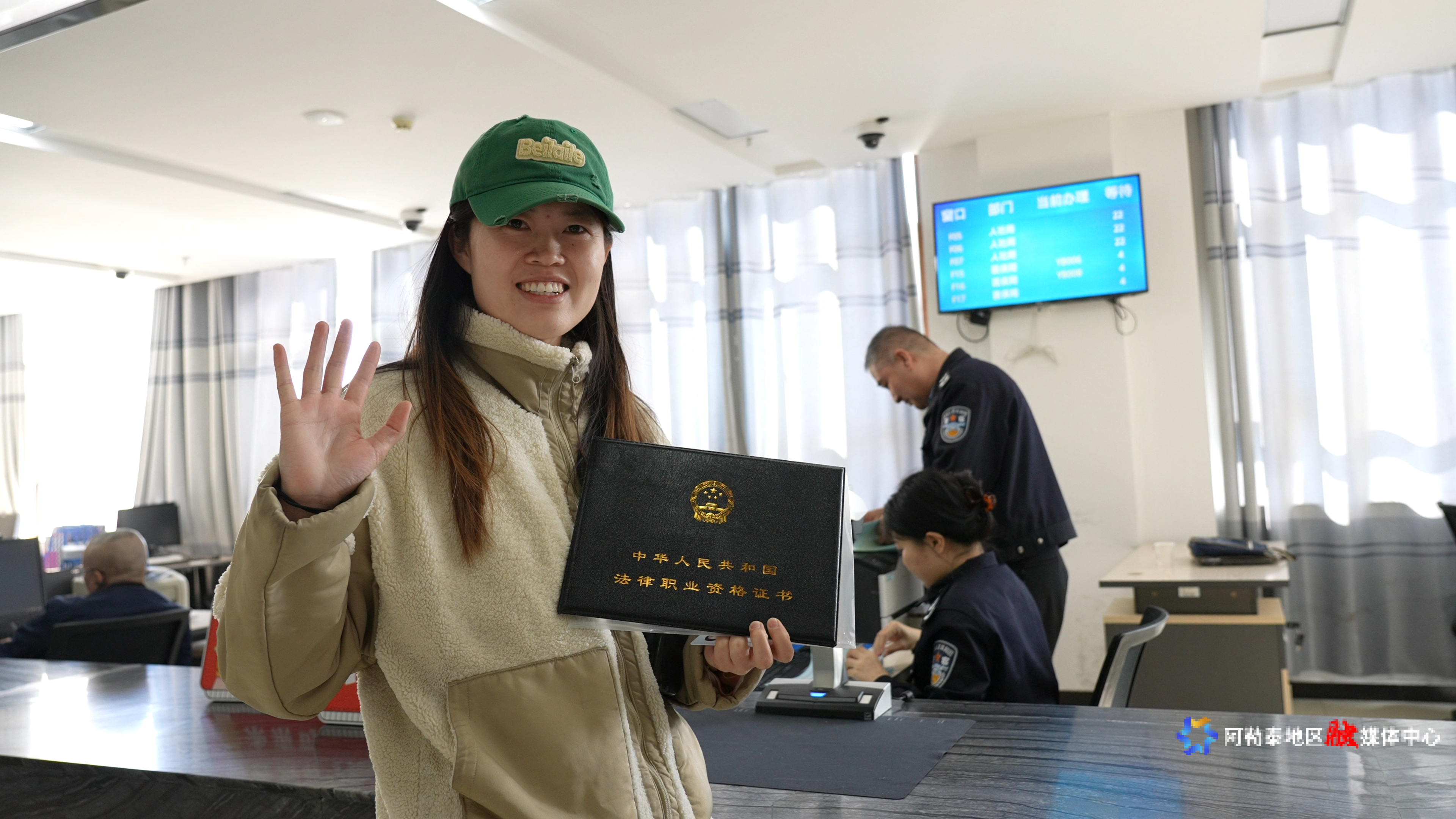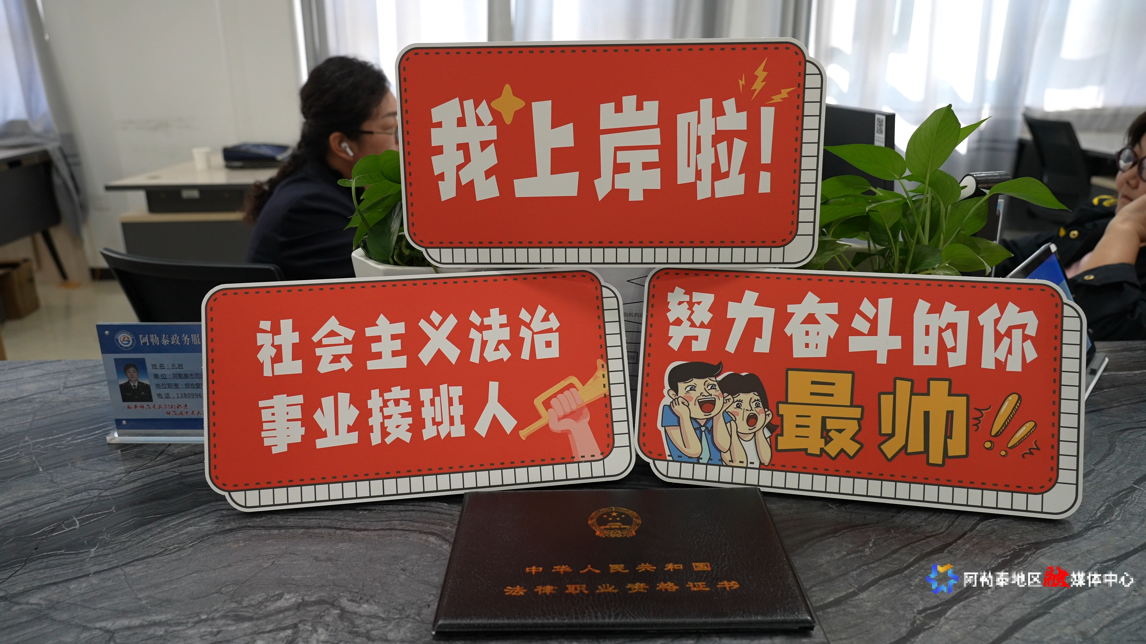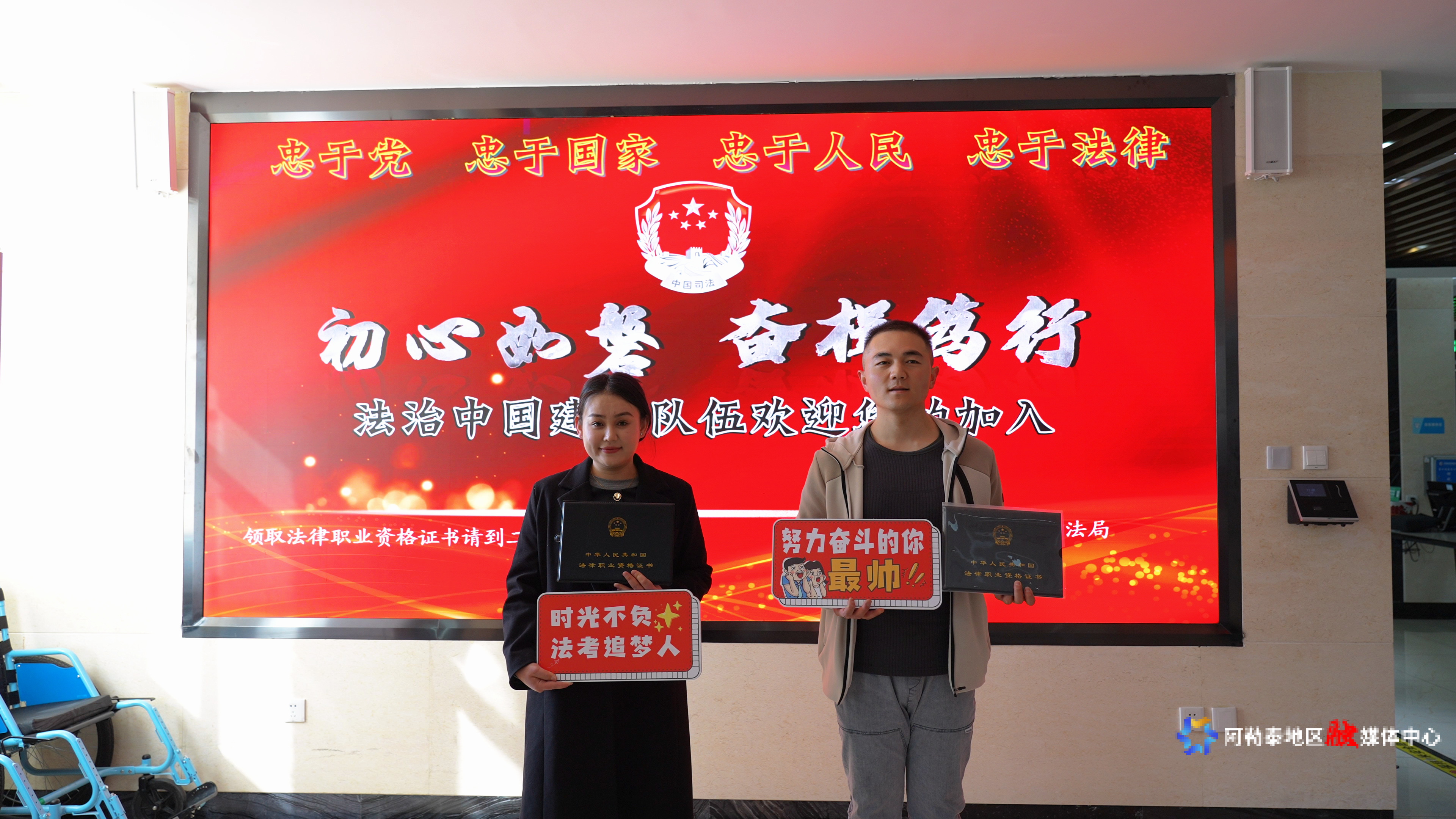 阿勒泰地区司法局在发证现场设置多个“法考”打卡点及电子喜报背景墙,供领证人员进行拍照及视频留念。这一举措不仅让领取证书的考生在社交媒体上与亲朋好友分享喜讯,也进一步提升了法律职业资格考试的社会影响力和认可度。