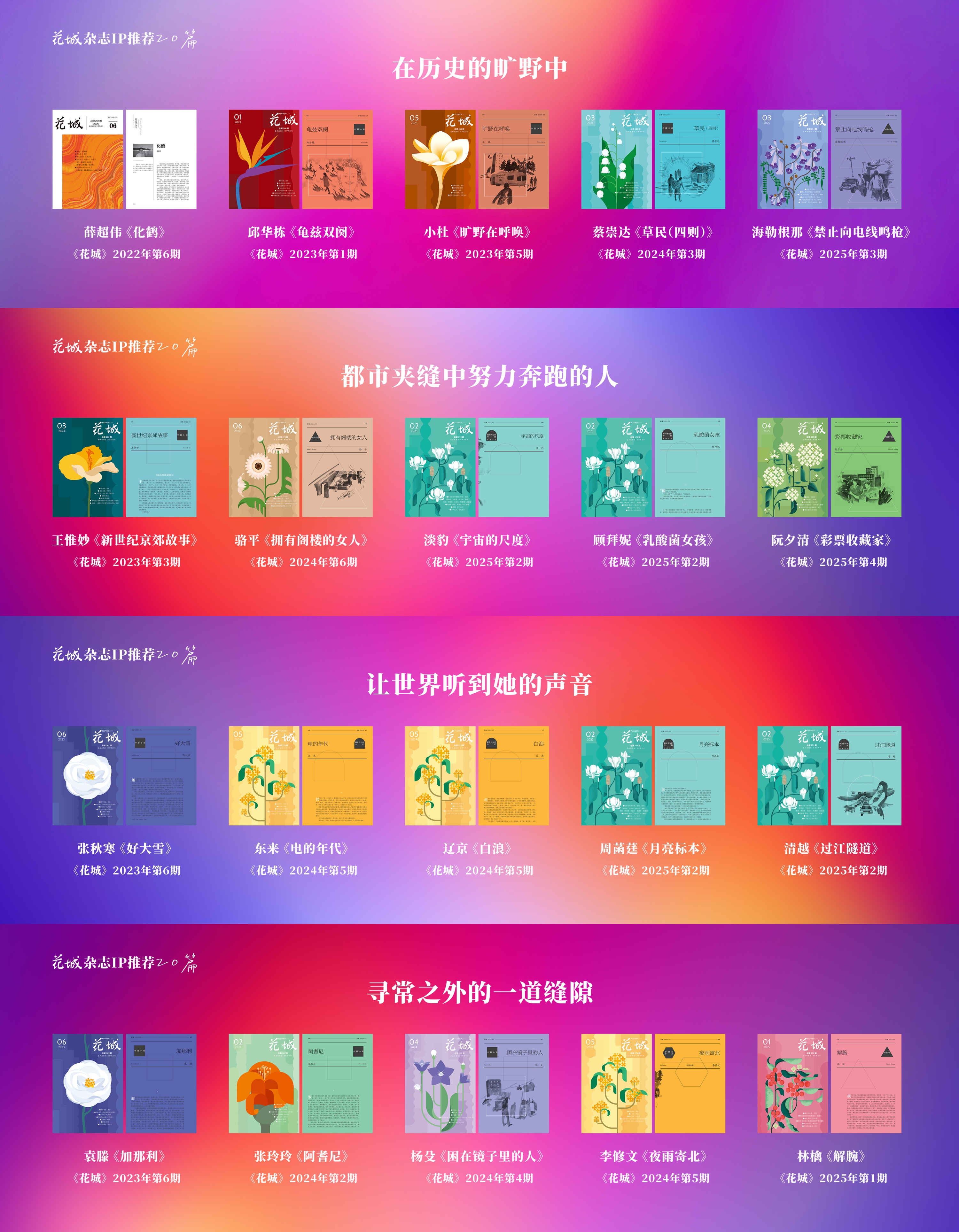 《花城》杂志的20个文学IP分为“在历史的旷野中”“都市夹缝中努力奔跑的人”“让世界听到她的声音”“寻常之外的一道缝隙”四个单元。