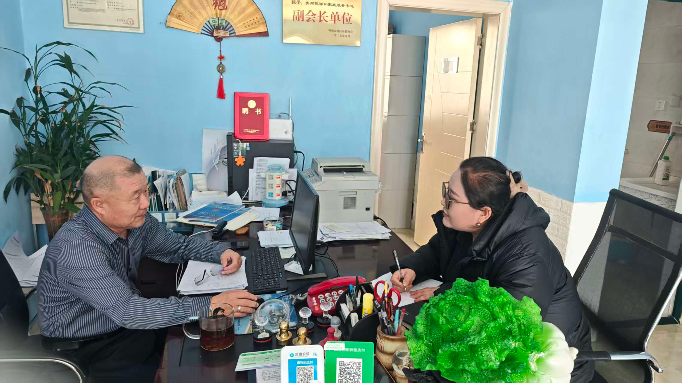 青河镇社区干部巴合努尔·叶尔杰甫走访青河县祥和家政有限责任公司。通讯员 汤旸摄