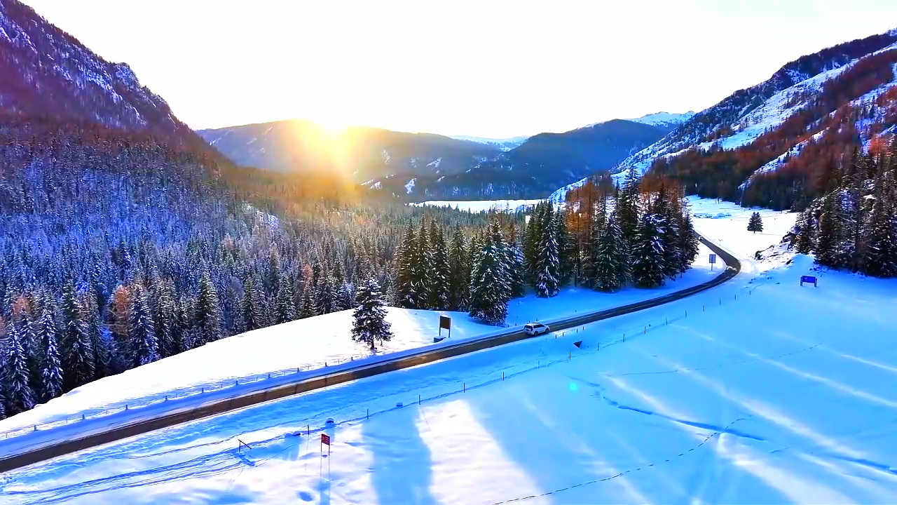 公路嵌雪原,车过留痕,让冬日静景添烟火。