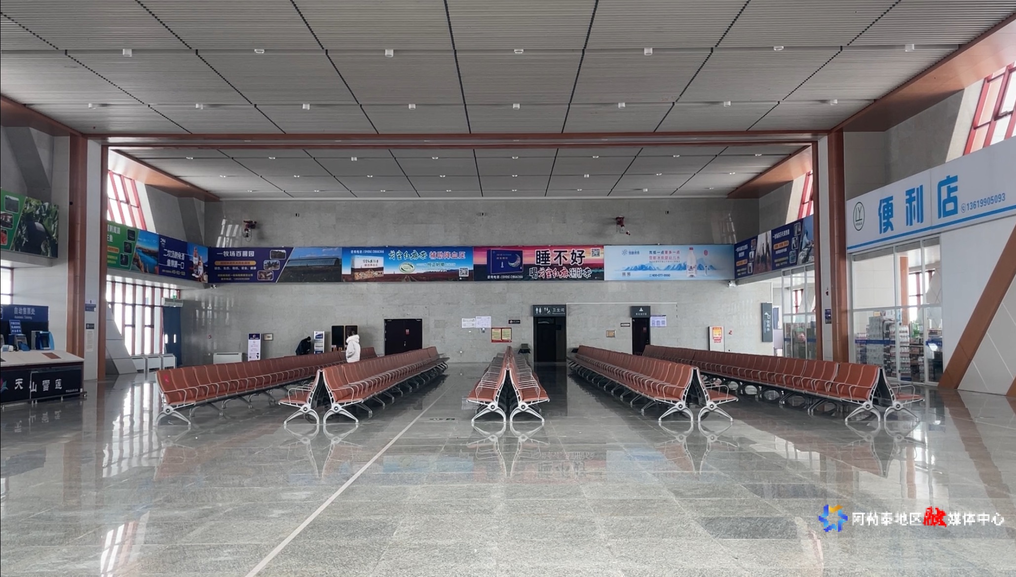 刚结束清洁工作无列车驶入驶出时段的阿勒泰火车站候车厅。