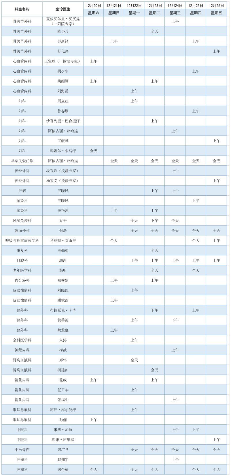 阿勒泰地区人民医院专家门诊坐诊表(2025年12月20日<周六>至12月26日<周五>)