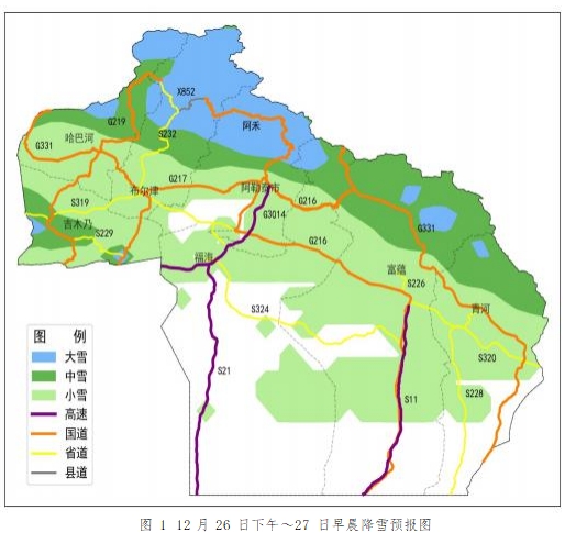 预计:12月26日下午~27日早晨,福海县、富蕴县、青河县大部多云断续有微雪;吉木乃县、哈巴河县、布尔津县和阿勒泰市有小雪(新增积雪2~4厘米);