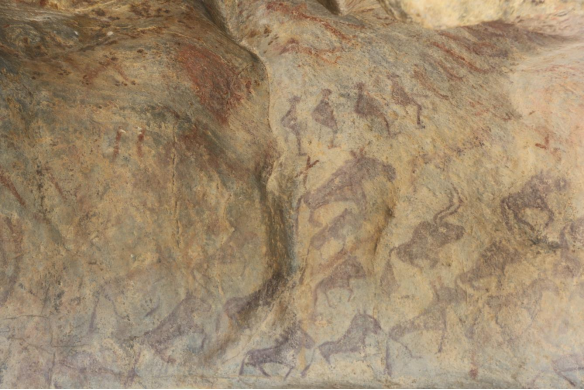 墩德布拉克洞穴彩绘岩画中,至今仍清晰记录着一万两千多年前的古阿勒泰人脚踏滑雪板狩猎的身影,那是人类滑雪最早的信证。 库奋·尼格买提 摄