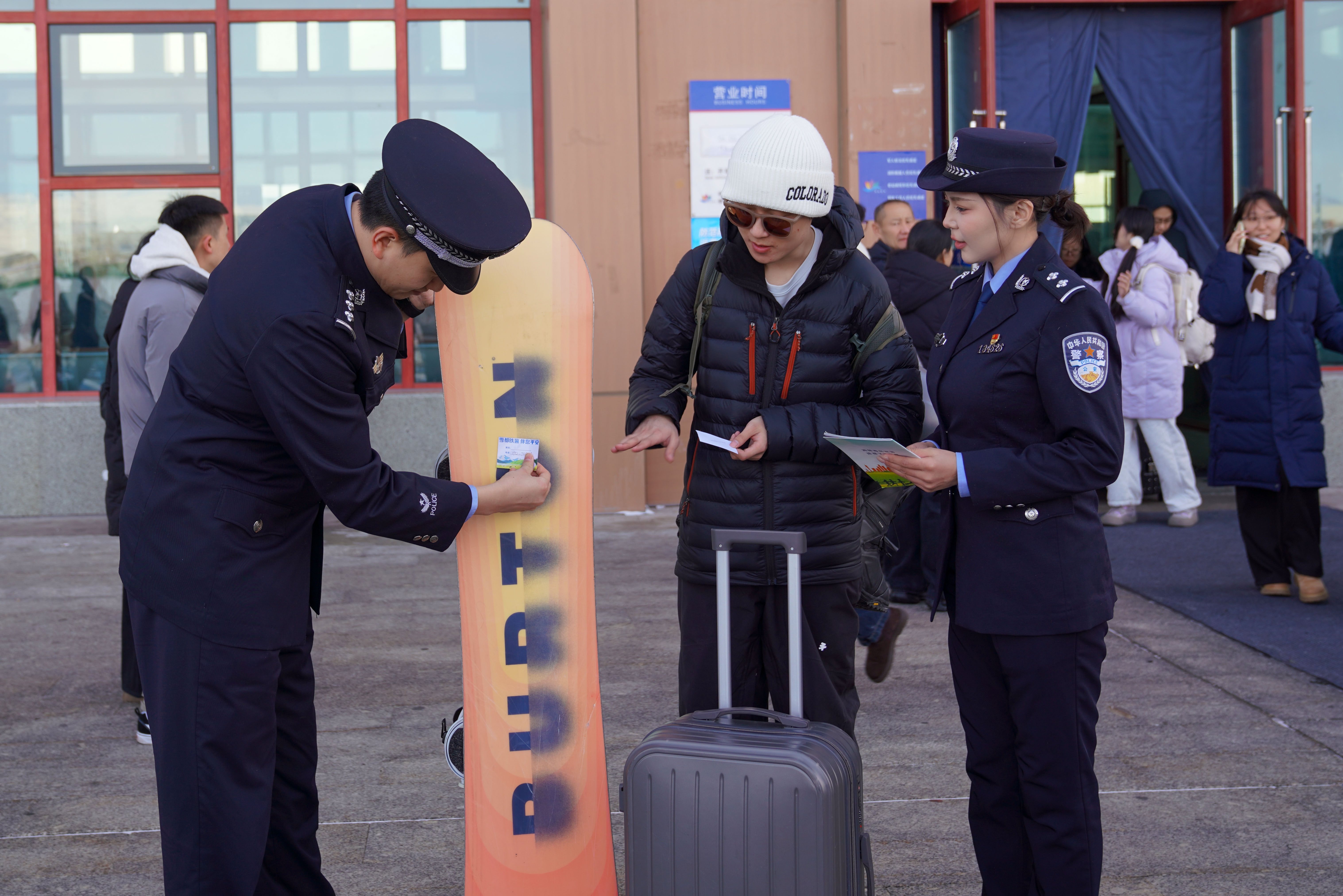 民警为旅客讲解出行安全提示,并在旅客雪具上粘贴安全提示卡警民联系贴。通讯员 张艳军摄