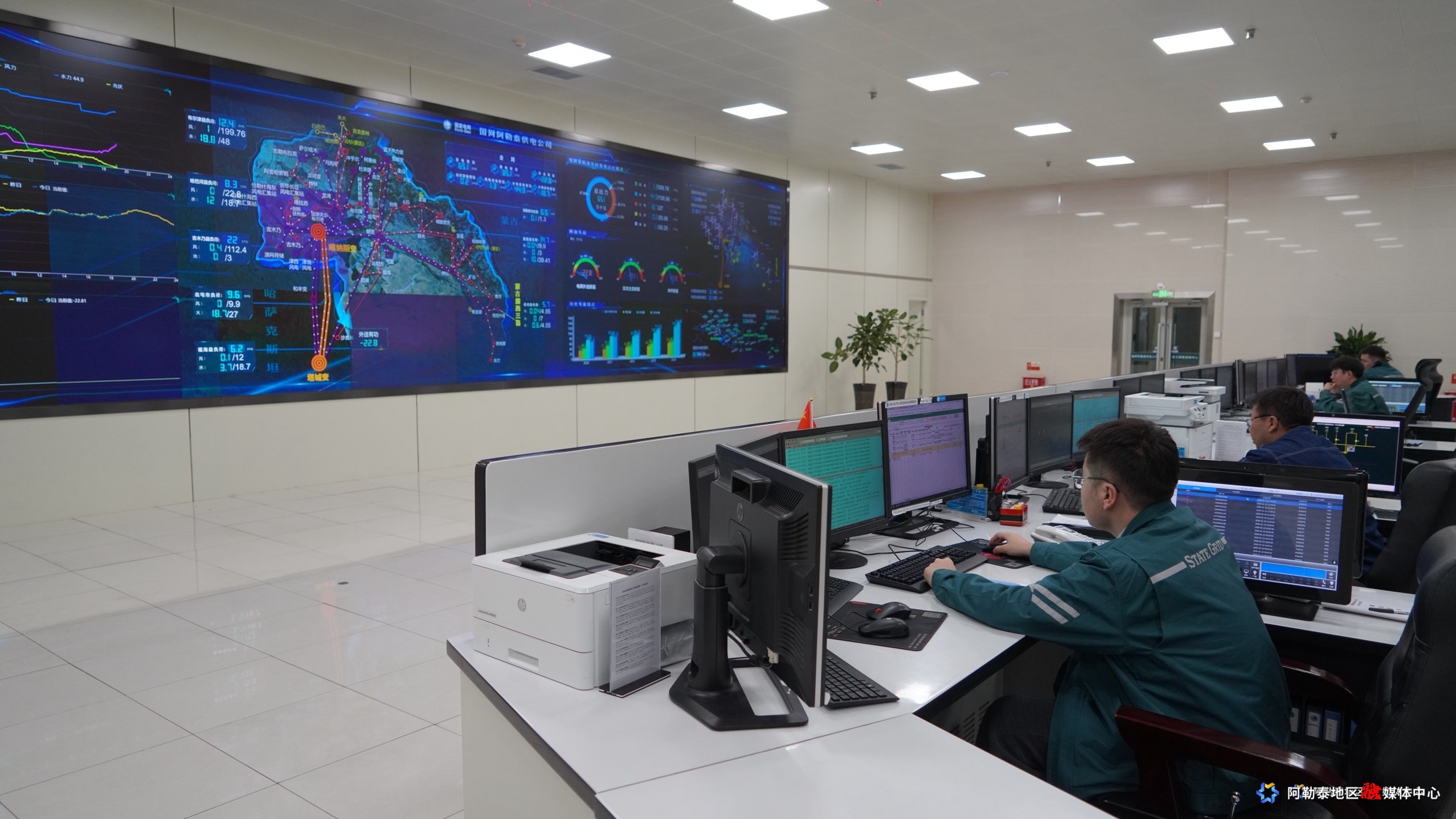 国网阿勒泰供电公司电力调度控制中心工作人员正在监测数据。记者 朱马别克·卡德尔别克摄