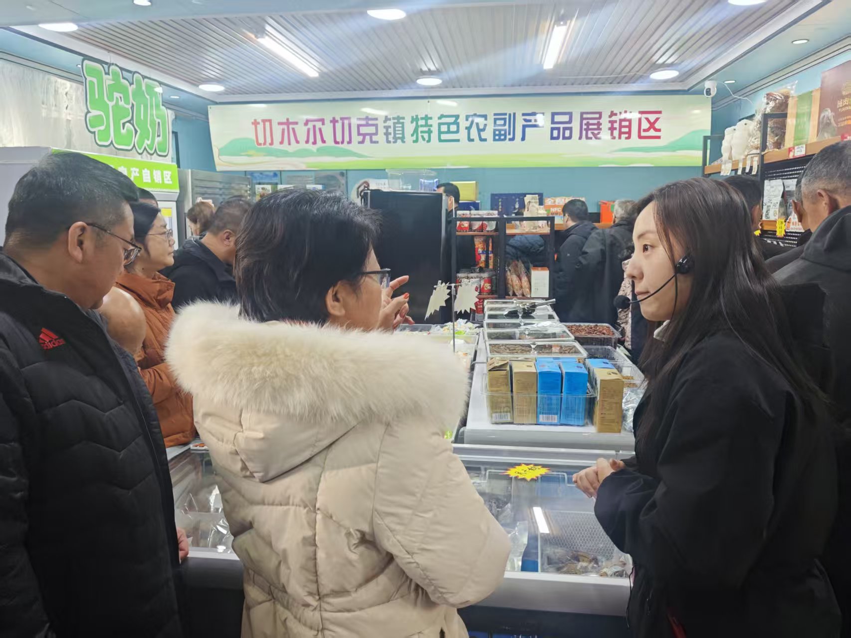“快来看看嘞!正宗雪都小骆驼精品骆驼肉礼盒,肉质鲜嫩、真空包装,当年货送亲戚朋友再合适不过!”2月5日,切木尔切克镇“日照金山”服务站内,专干周宇热情地向来往群众介绍特色年货。他身前的货架上,骆驼肉礼盒、奶疙瘩、奶皮子等本土特产整齐码放,包装精美又大气。作为大学生西部计划志愿者,周宇不仅忙着接待顾客,还特意为其他西部计划志愿者推出大幅优惠,贴心的服务让订单量一路上涨。