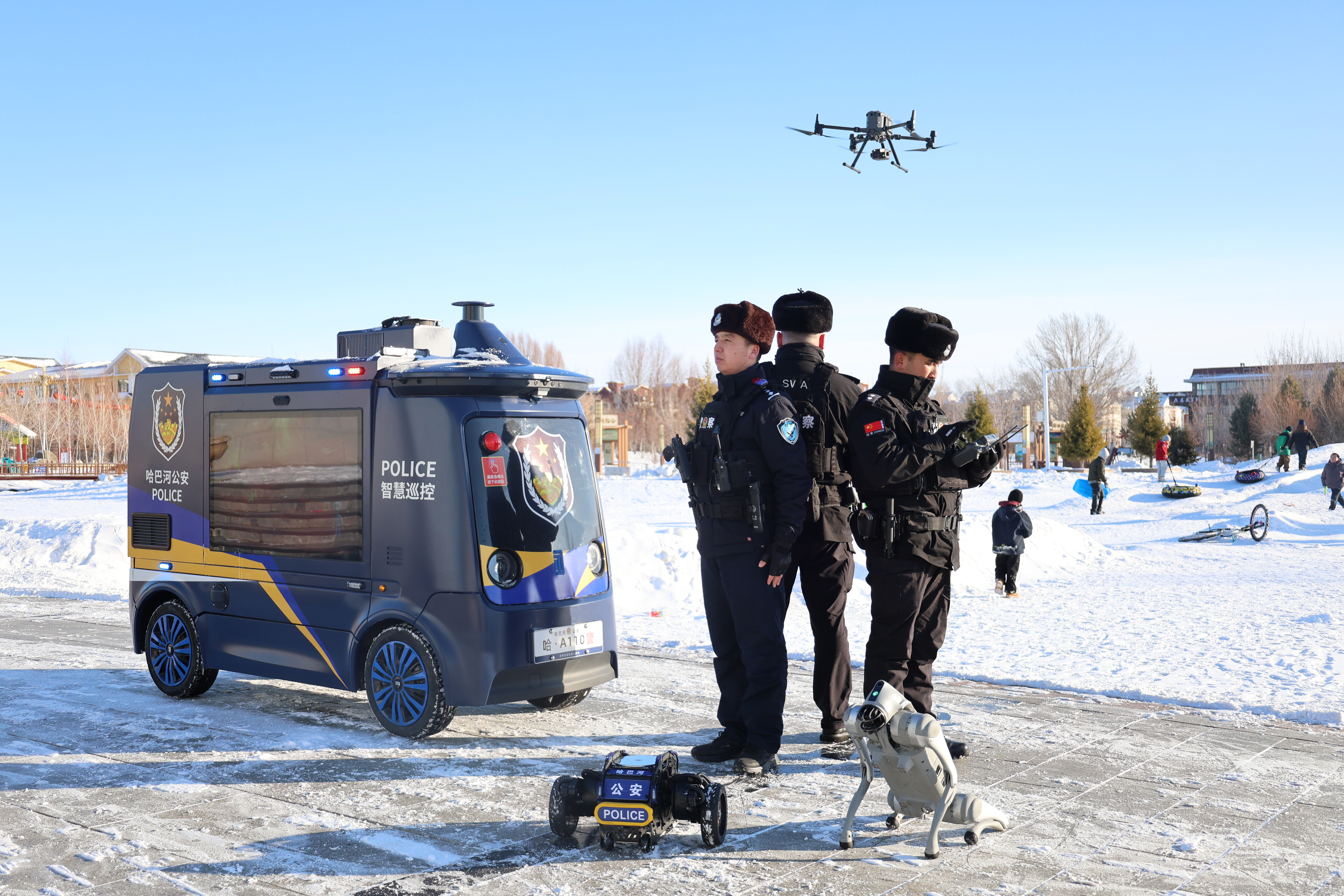 2月12日,哈巴河县公安局特警大队在县北区广场利用无人机、机器狗、无人车+警力开展空地一体化巡逻执勤。