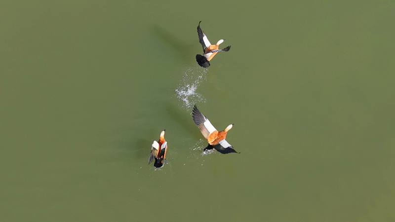 此次现身的赤麻鸭,是阿勒泰地区的常见鸟种,也是候鸟迁徙中最晚离开的鸟类之一。其全身栗黄色的羽色辨识度极高,颈部狭窄的黑色颈环与翼上醒目的白色斑形成鲜明对比,铜绿色的翼镜在阳光下熠熠生辉。它们偏好平原湖泊、河流及沼泽等淡水水域,常以数十只至数百只的群体活动,在浅滩和陆地间觅食,是湿地生态系统健康与否的重要“指示物种”。