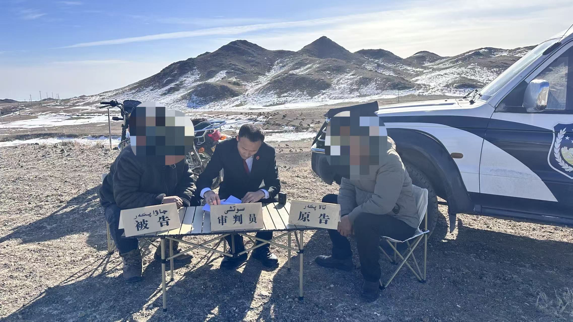 阿勒泰新闻网-阿勒泰地区融媒体中心(记者 古扎丽·阿布都热西提 通讯员 拉扎提·阿德力别克)4月初,苍茫辽阔的阿尔泰山南麓,初春的牧场依旧白雪皑皑,寒风凛冽。吉木乃县人民法院“马背法庭”的工作人员再一次踏上巡回审判之路,工作人员带着国徽与法槌,穿越数百里戈壁,靠一张简易折叠桌、三块清晰醒目的身份牌,把法庭“搬”到了牧民身边,让他们真切感受到司法的温度。