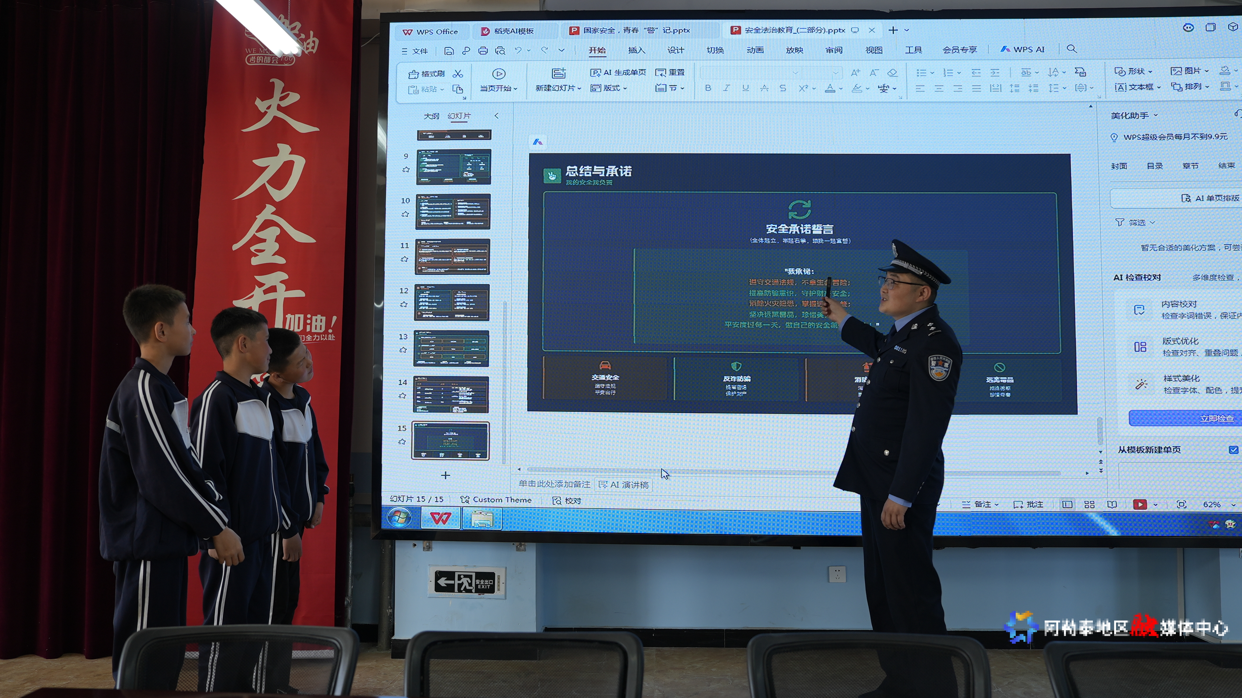 福海县初级中学(西校区)内,城镇派出所民警借助专业APP,围绕政治安全、网络安全等内容,用通俗易懂的语言解读相关法律法规,帮助学生辨别安全风险,引导青少年扣好国家安全“第一粒扣子”,压紧压实校园安全责任,让“国家安全、青春同行”理念深入人心。