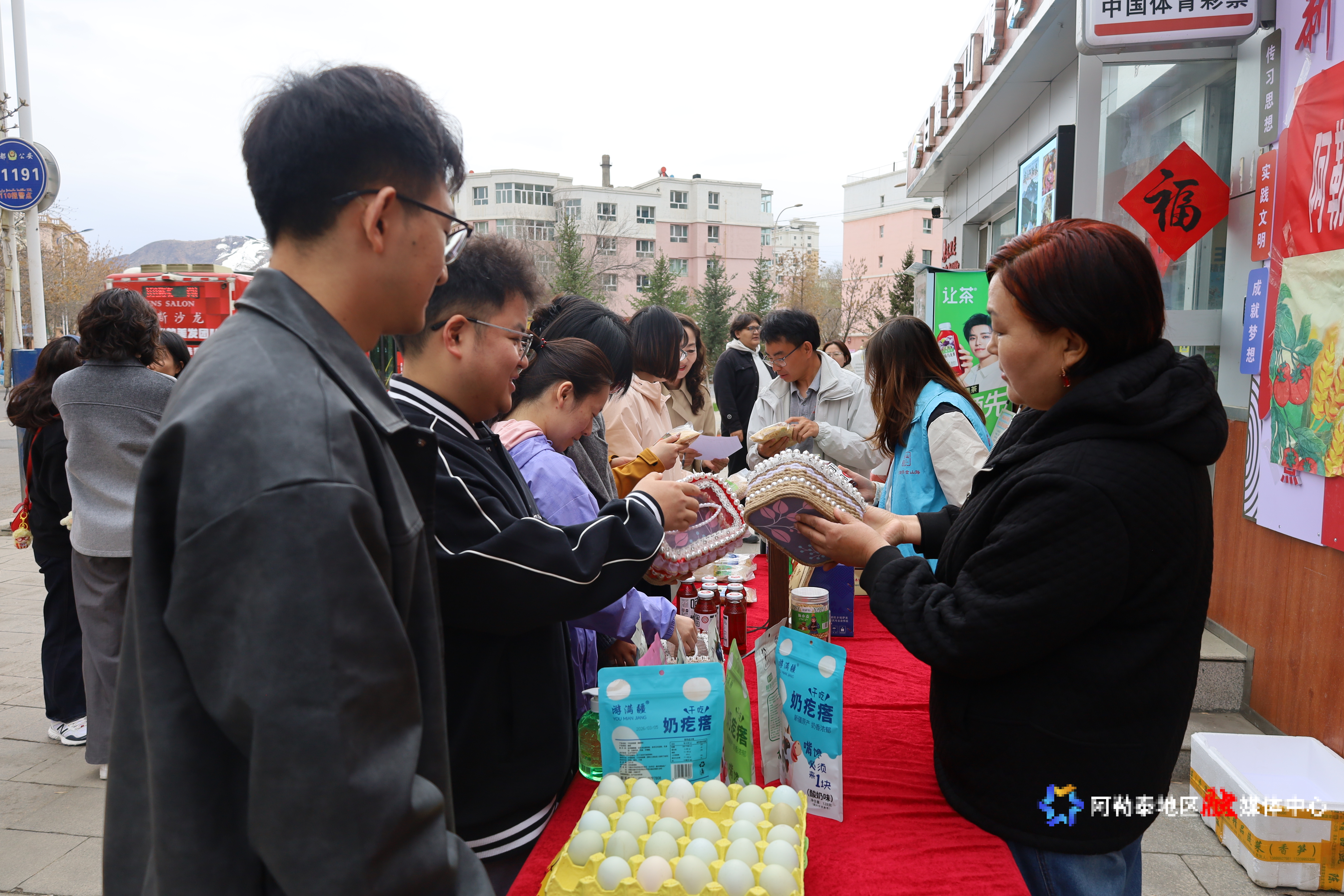 4月17日,阿勒泰市全民阅读主题系列活动现场,市民在萨尔胡松乡“日照金山”服务站助农展销摊位前选购本地特色农特产品。