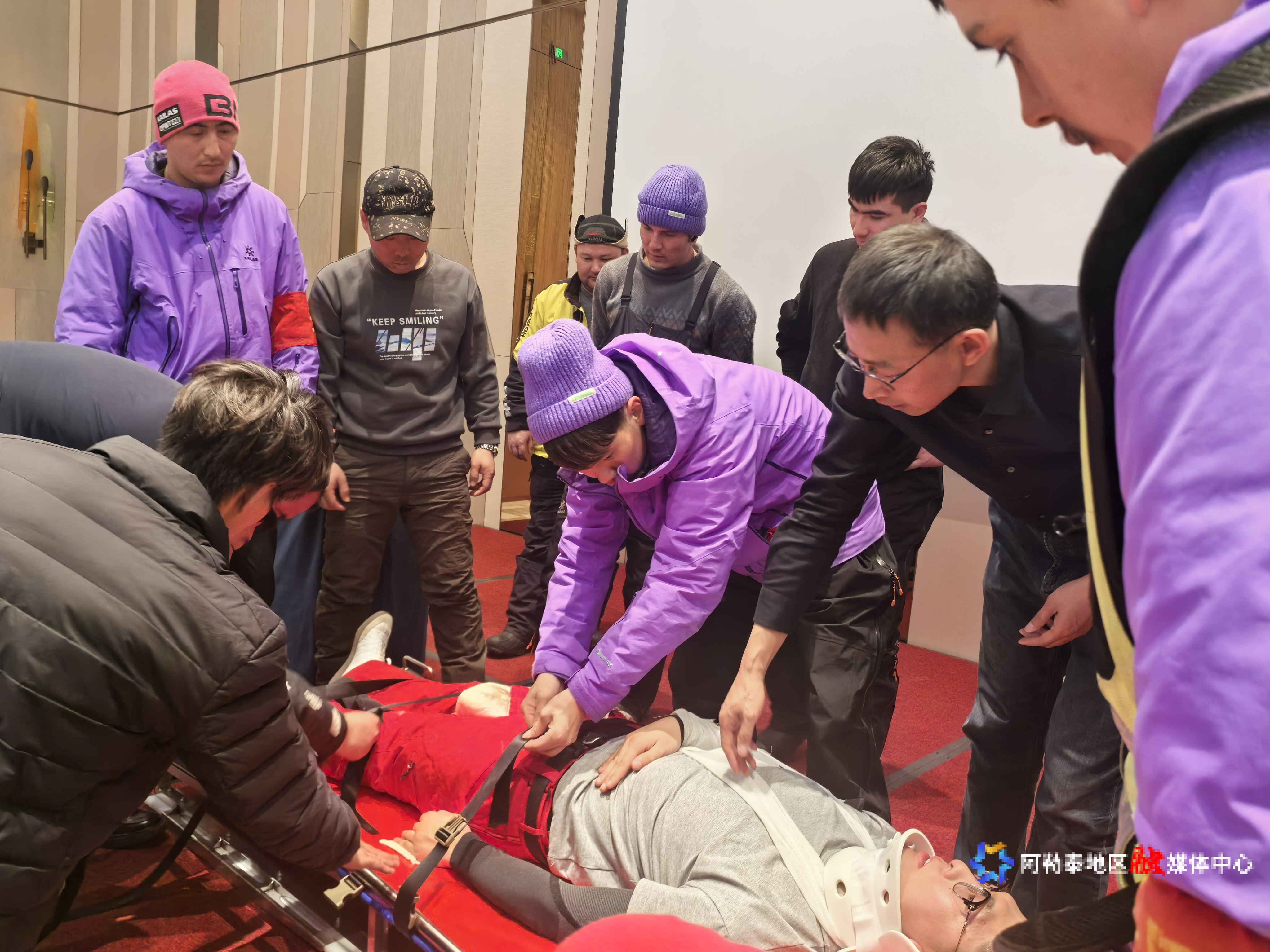 “科技之冬”活动中,地区人民医院骨科及心肺专家,为新疆吉克普林冰雪旅游有限公司职工开展应急安全救护知识“理论+实操”科普培训。地区科协供图