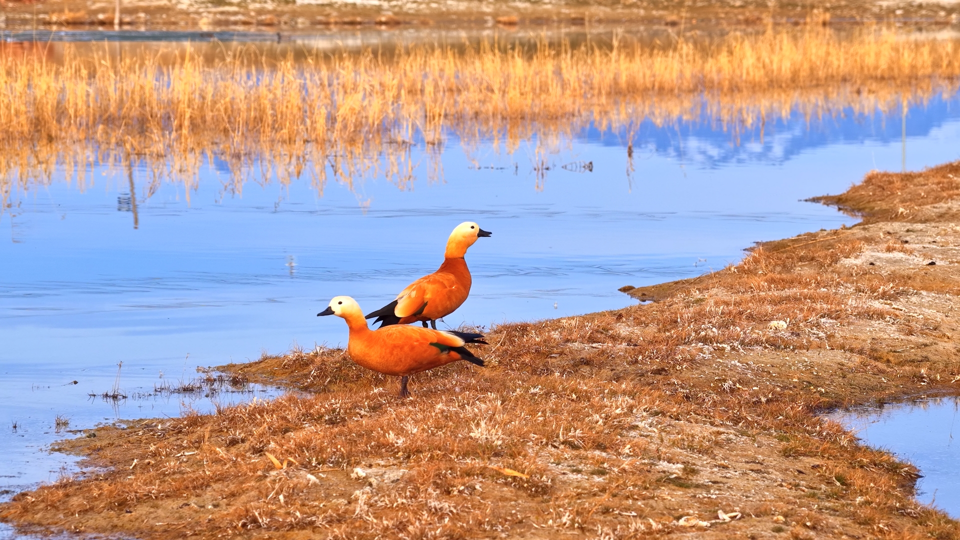 春水映芦苇,一对赤麻鸭静立滩涂,勾勒出阿勒泰湿地的温柔剪影。