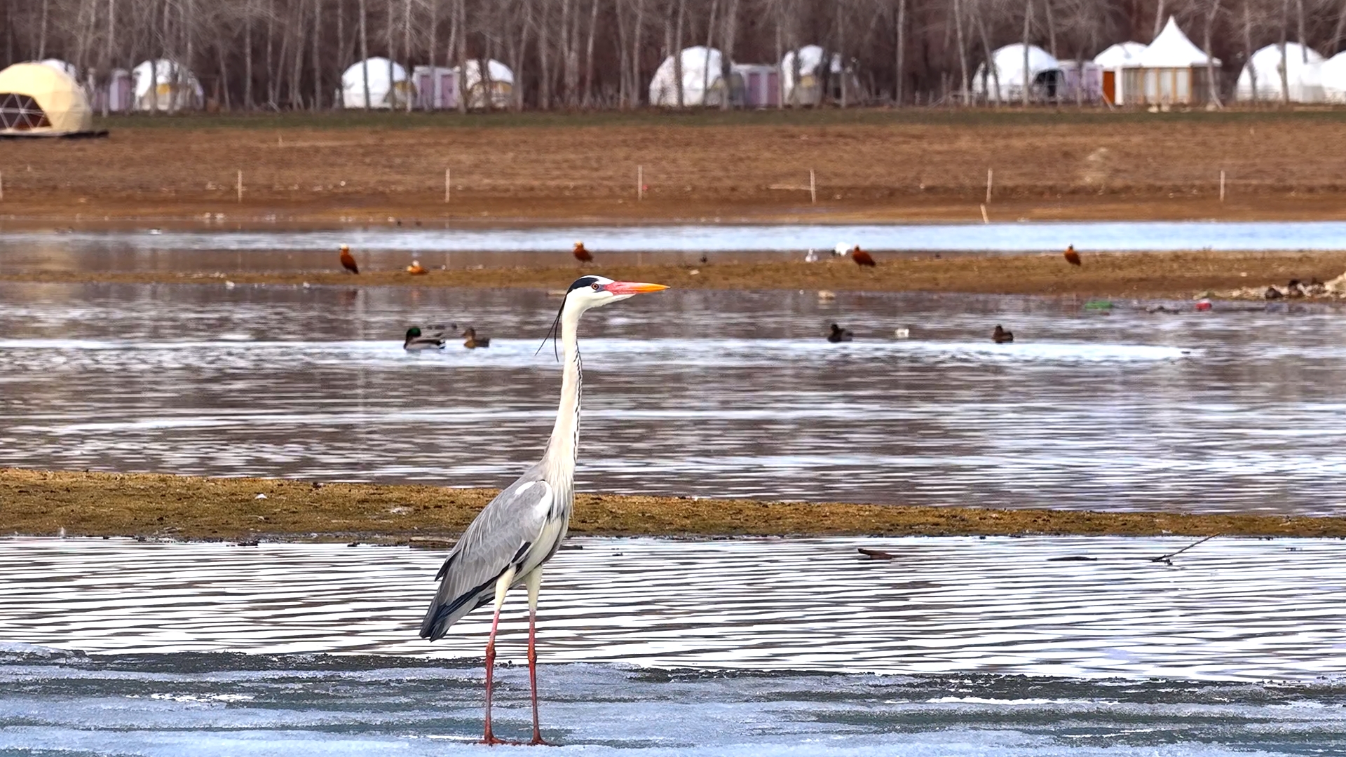 一只苍鹭静立阿苇滩水库冰面,身姿挺拔,为湿地勾勒出一抹优雅的剪影。