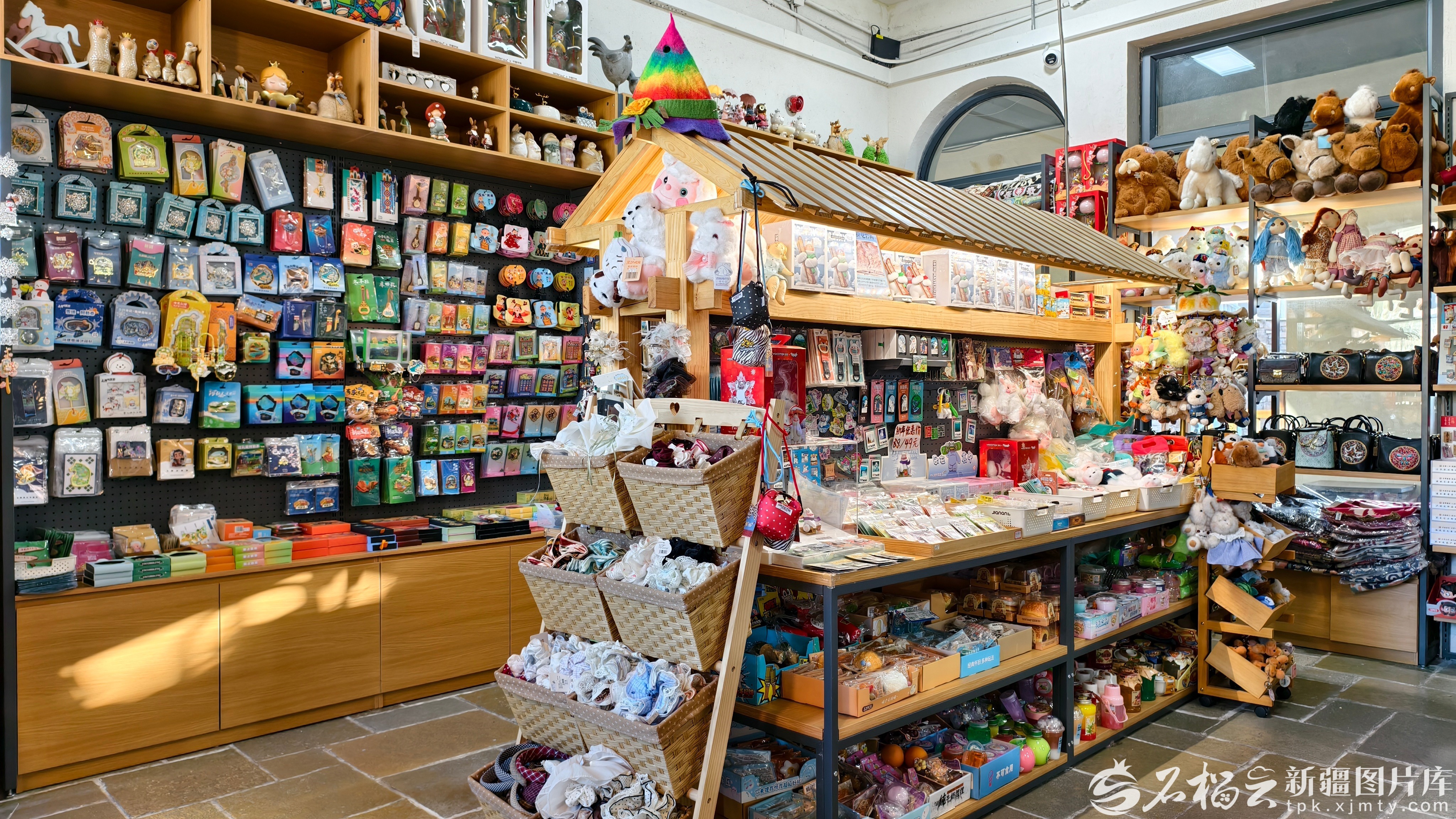 文创旅游纪念品区是店里的亮点——毡房造型的文创旁,摆放着馕造型的背包、覆盖着奶油般积雪的禾木木屋冰箱贴……传统乐器、手工包、花帽等搭配出一个个特色的角落。咖啡和甜品同样充满巧思,带着“阿勒泰角落”字样的奶盖咖啡,画有山、羊等图案的乳酪蛋糕,是不少读者来这里阅读时必点的甜品组合。