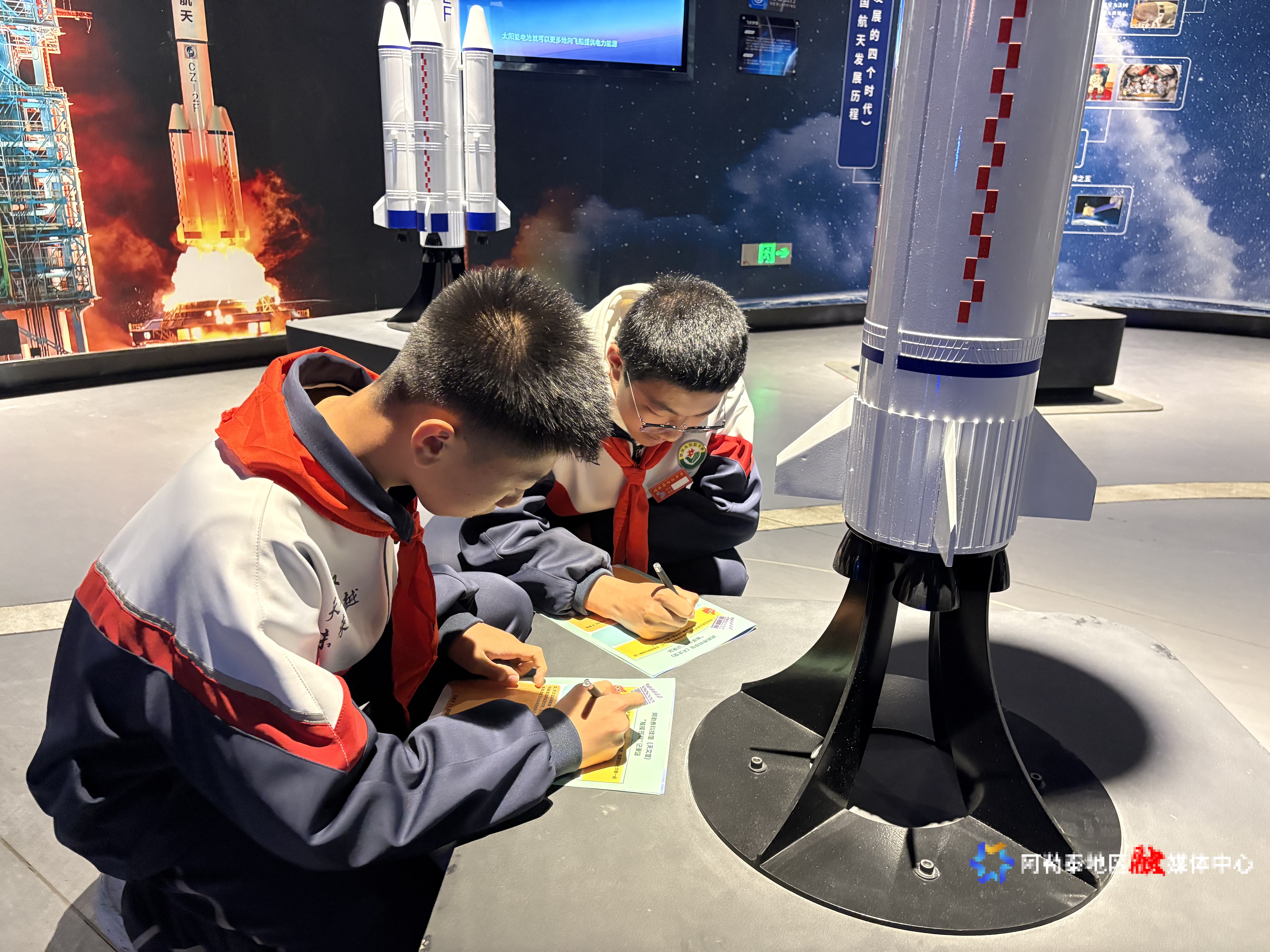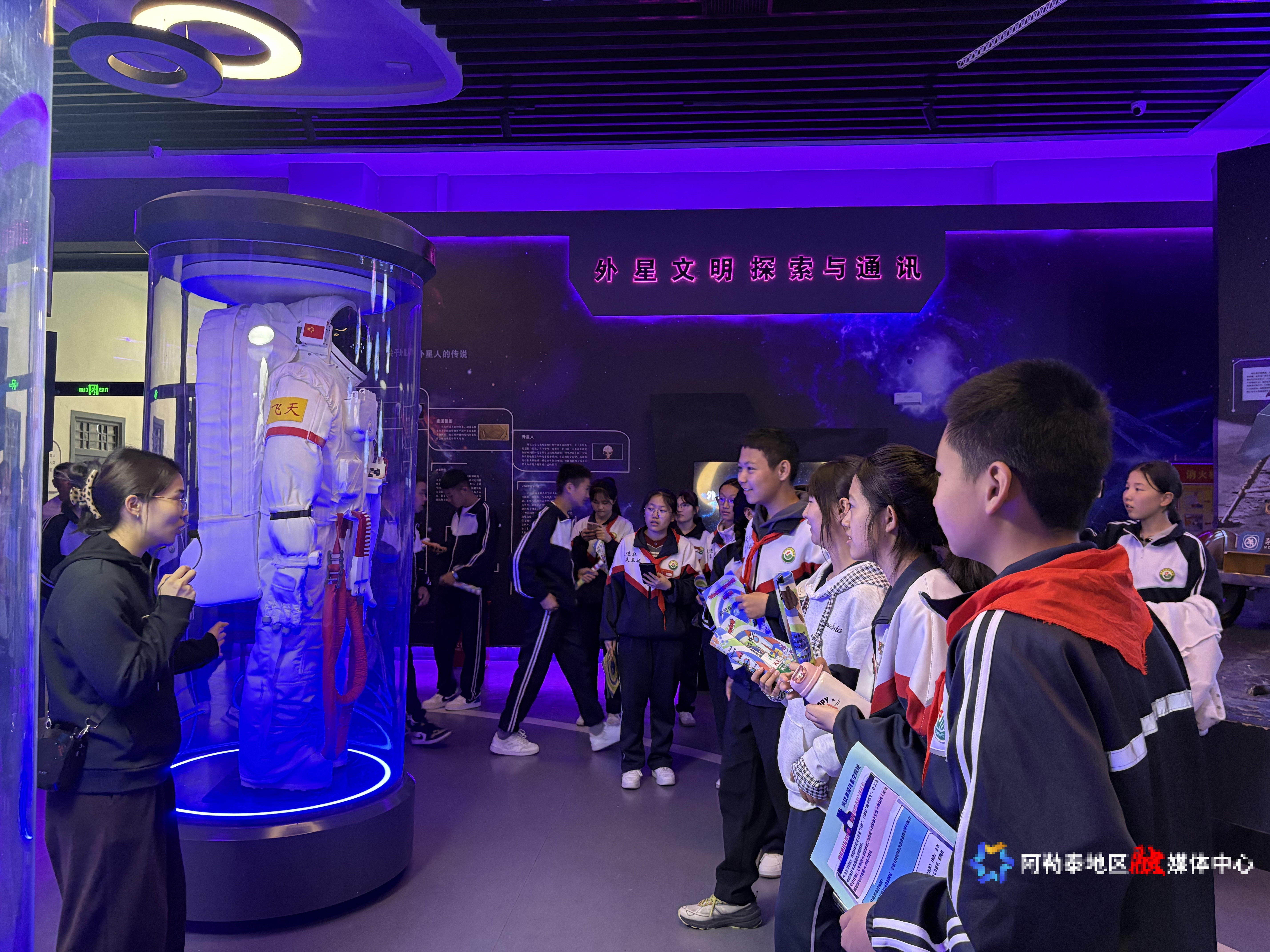 同学们在阿勒泰科技馆(天文馆)对航空航天内容十分感兴趣。