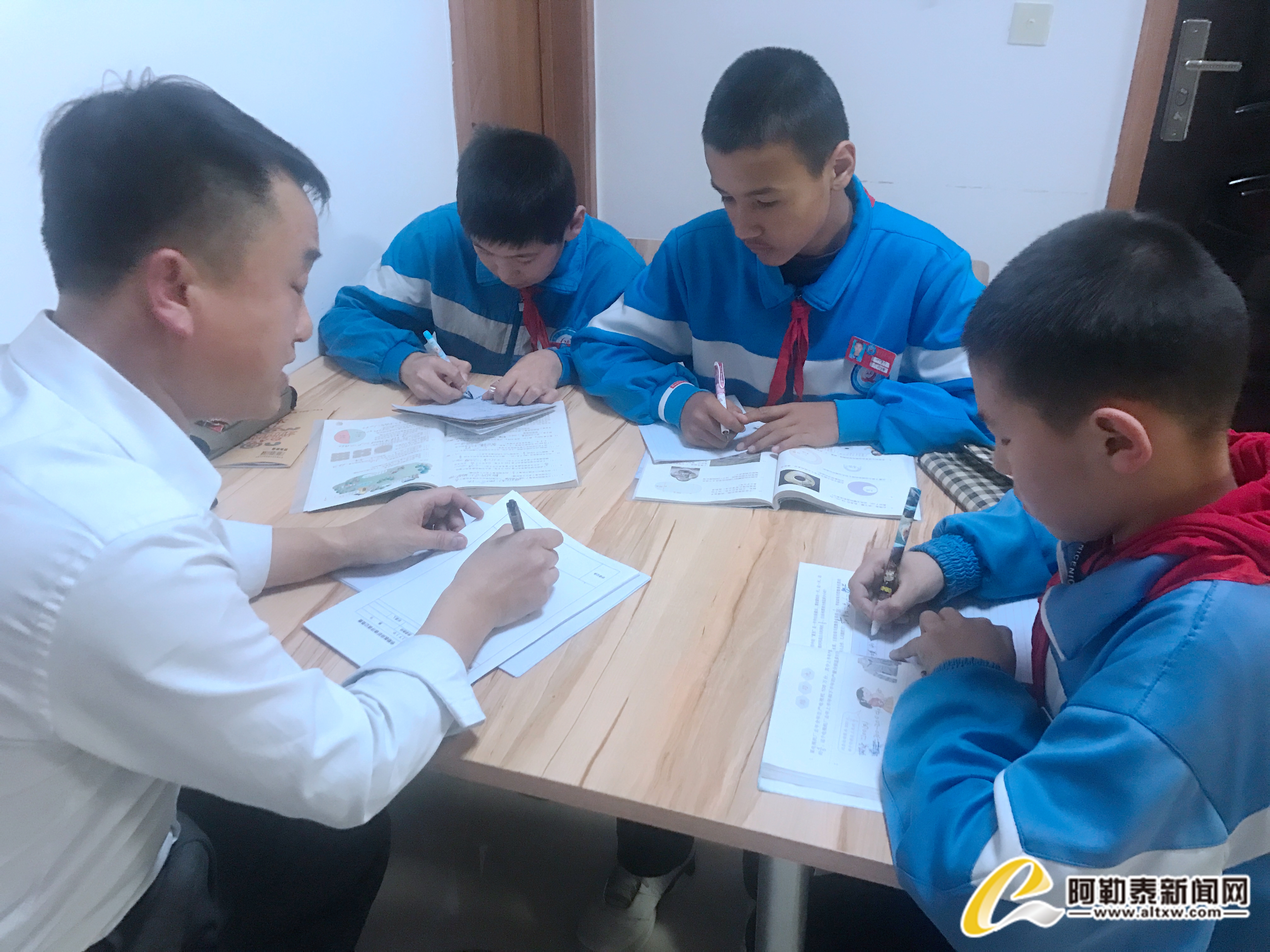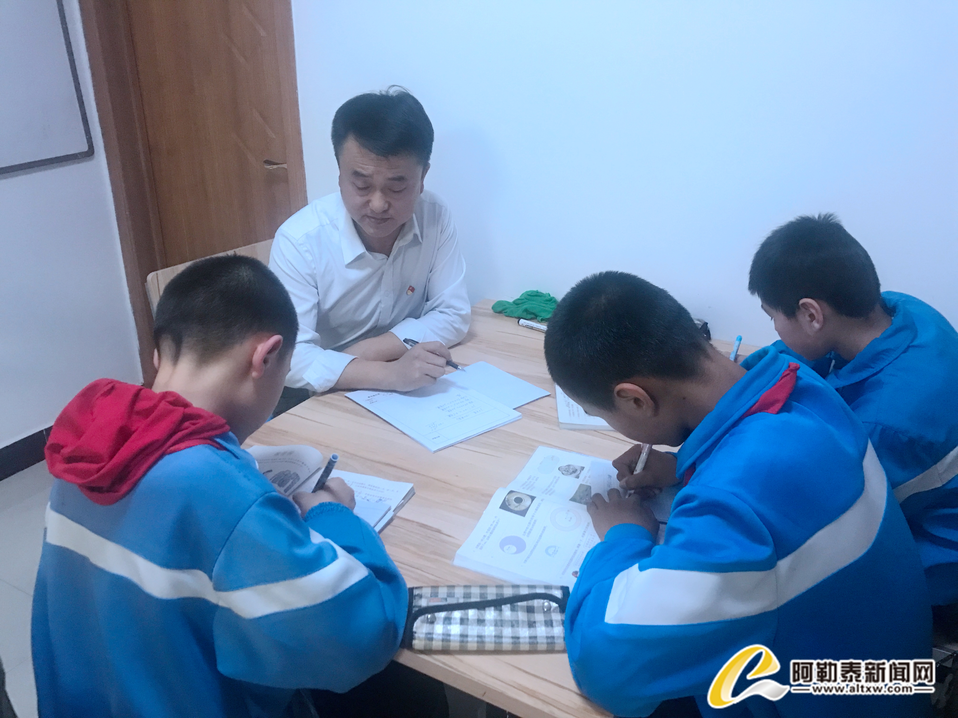 每到傍晚时分,三五个小学生就围坐在小课桌前,青河县中学教务处副主任、援疆干部贺泽利在这里给孩子们讲解习题,帮助孩子复习功课。