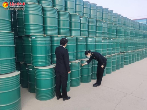阿克苏海关关员对出口浓缩苹果清汁进行监管。通讯员张婷摄