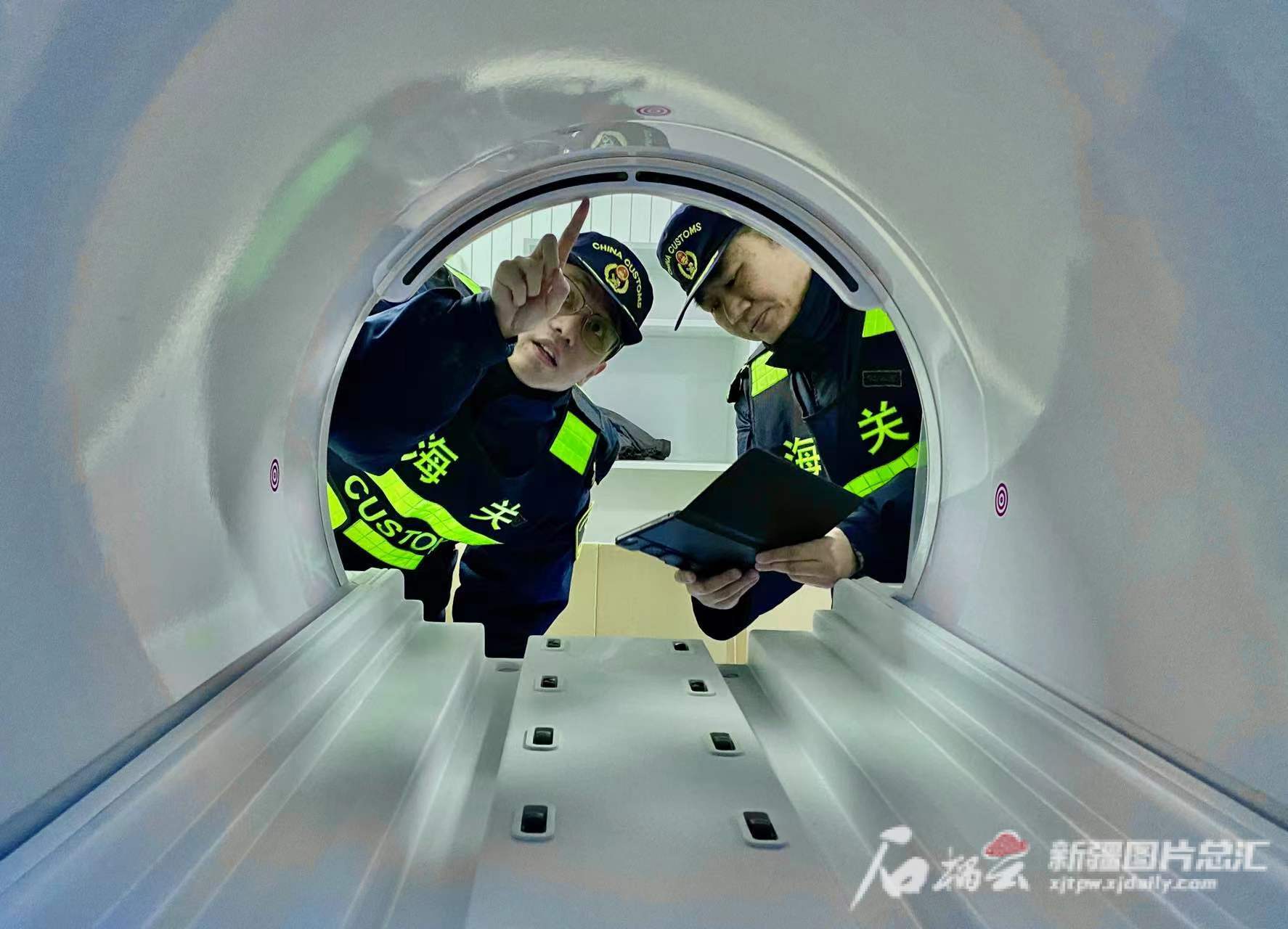 3月24日,石河子海关关员查验进口医疗设备。 谢浩 摄