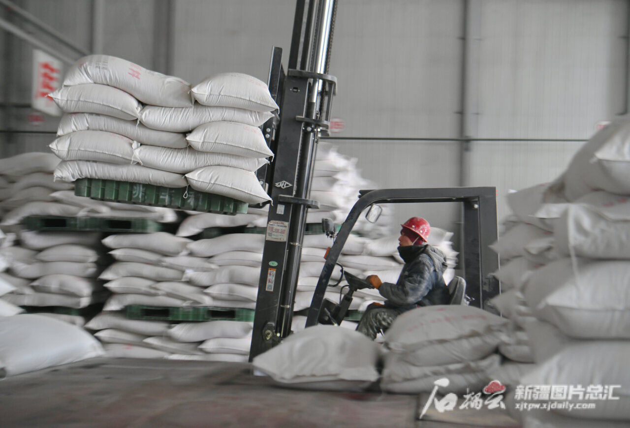 2月4日,员工在位于霍尔果斯综合保税区的新疆兆丰和生物科技有限公司生产车间搬运饲料。天山网-新疆日报记者 邹懿 摄