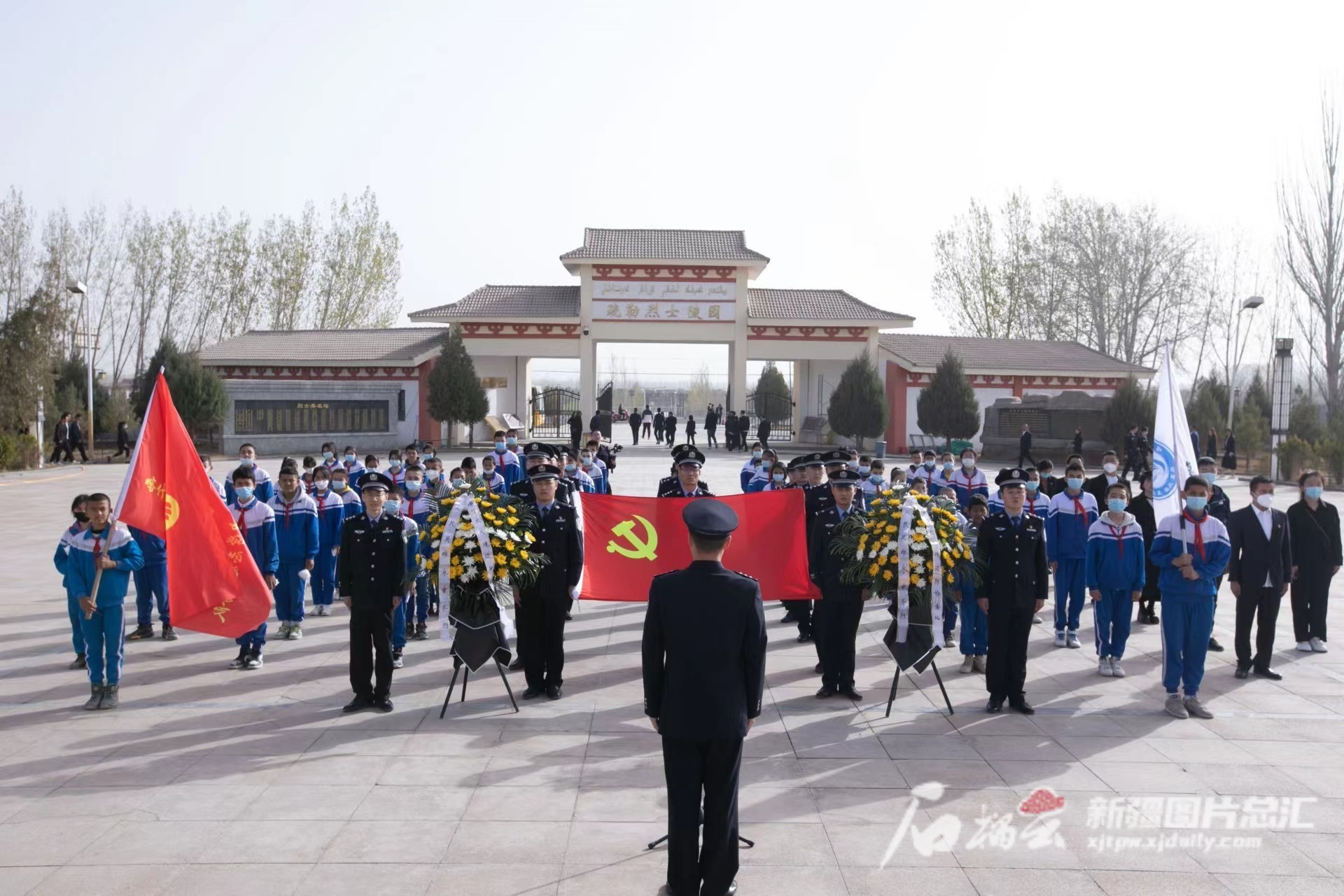 3月29日,喀什出入境边防检查站民警带领当地中小学生来到疏勒县烈士陵园,共同举行“致敬·缅怀·奋进” 主题党日活动。 董永刚摄