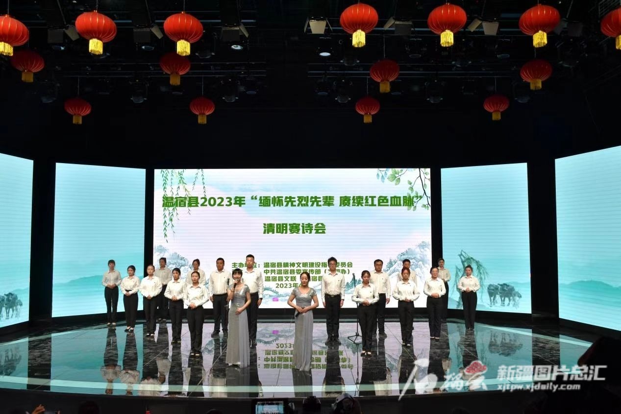 4月3日,温宿县举行2023年“缅怀先烈先辈 赓续红色血脉”清明赛诗会,图为参赛队伍在朗诵诗歌。西日娜依·吐尔洪摄