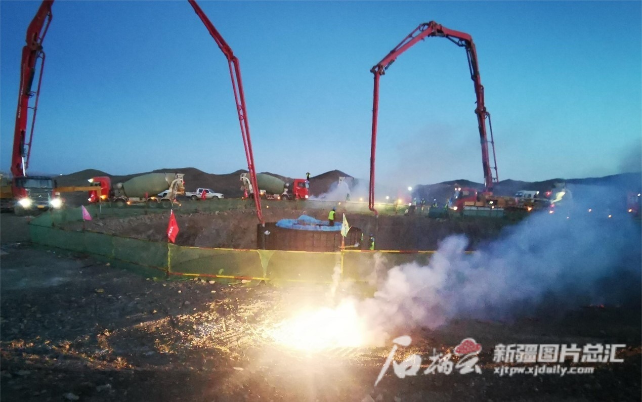 新疆新能源研究院总承包奇台20万千瓦风电项目首基风机基础浇筑现场。图片由新疆新能源研究院提供