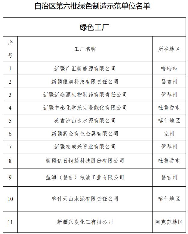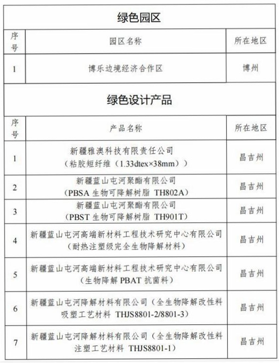 新疆广汇新能源有限公司、新疆雅澳科技有限责任公司、新疆新姿源生物制药有限责任公司、新疆中泰化学托克逊能化有限公司等11家企业入选绿色工厂;新疆雅澳科技有限责任公司 、新疆蓝山屯河聚酯有限公司、新疆蓝山屯河降解材料有限公司等4家企业的7种产品入选绿色设计产品;博乐边境经济合作区入选绿色工业园区。