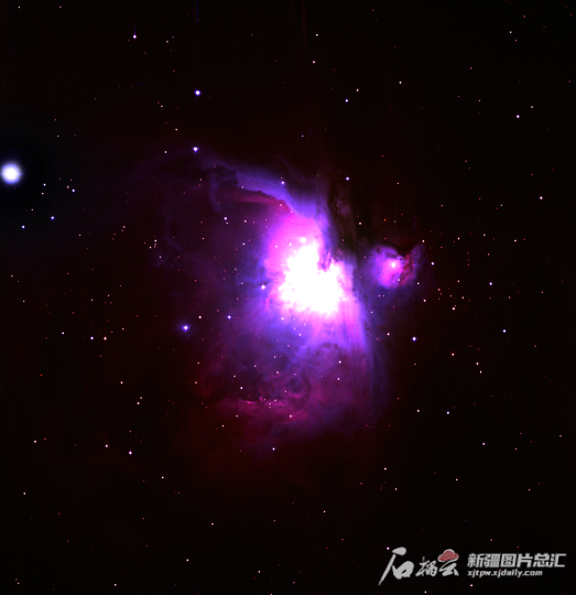 由中国科学院新疆天文台南山观测站1米大视场光学望远镜拍摄的猎户座大星云,像一只展翅飞翔的火鸟,又称“火鸟星云”。新疆天文台供图
