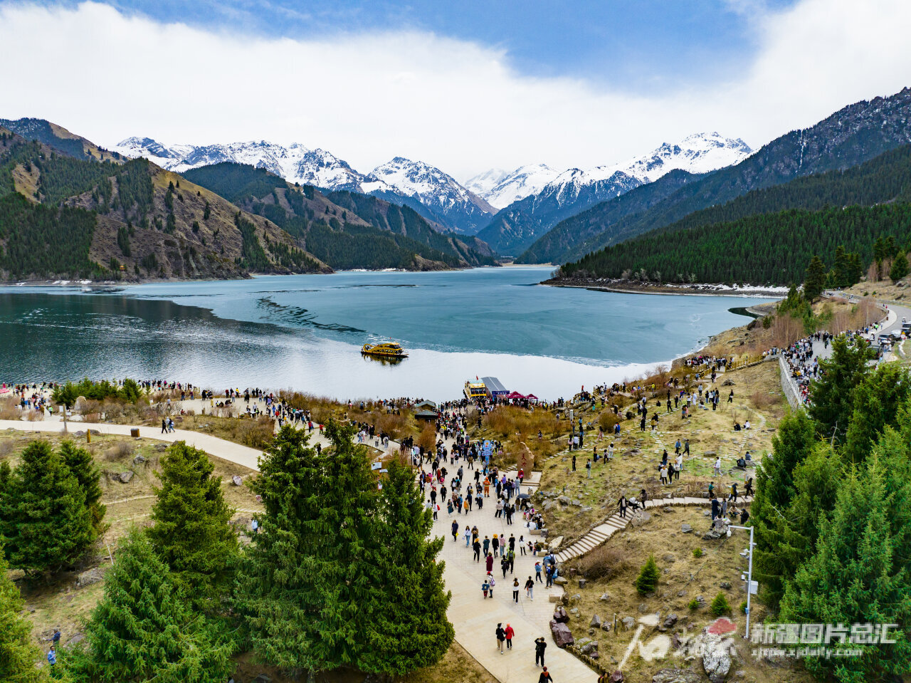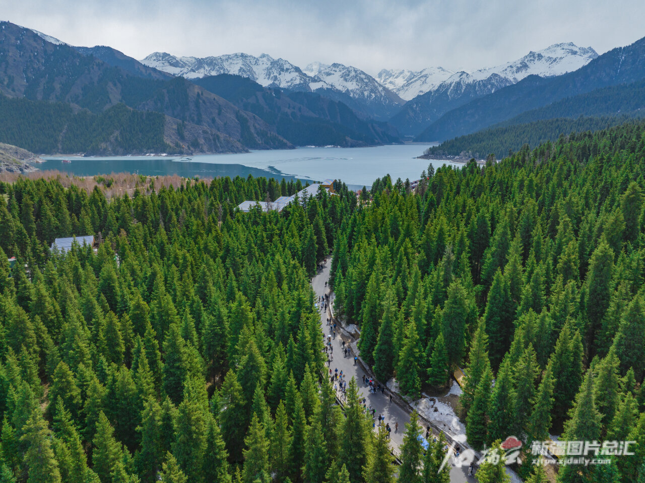 4月30日,游客在天山天池景区游览(无人机拍摄)。“五一”假期,天山天池景区春暖湖开,山水环翠,吸引了众多游客前来游览。据了解,“五一”假期前两天日接待游客超2万人次。何龙 摄