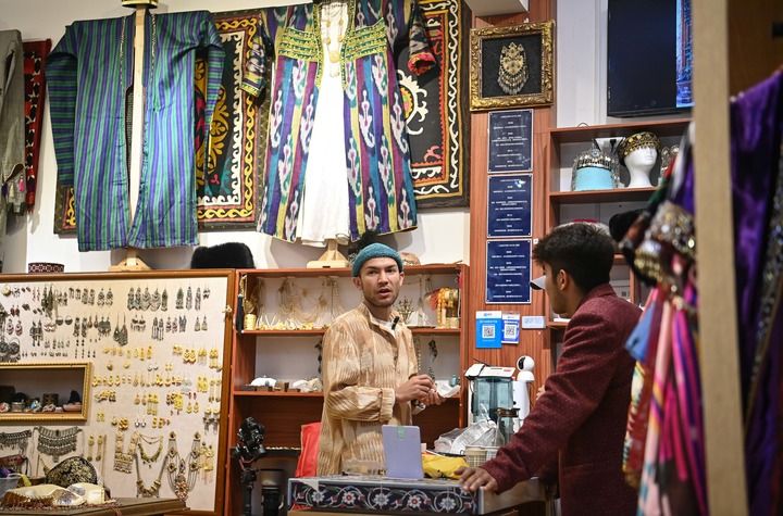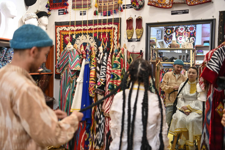 新疆喀什古城,麦吾兰·图拉克在店内为旅拍顾客介绍特色服装和配饰(4月21日摄)。新华每日电讯记者李响摄