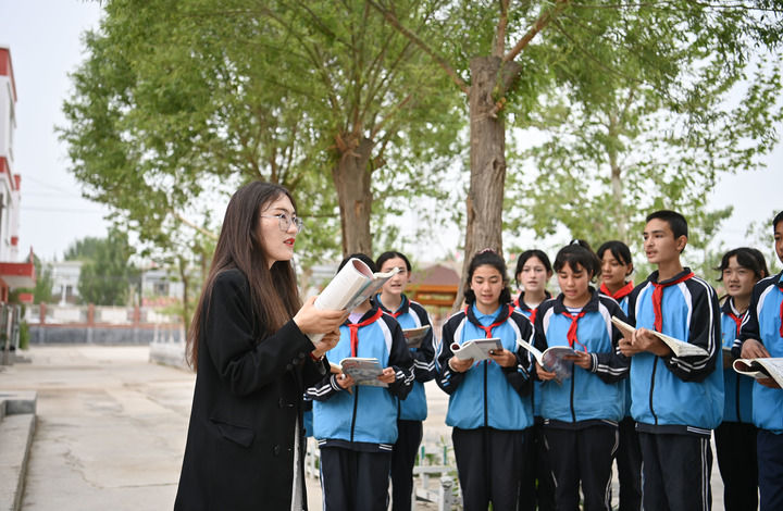 4月27日,新疆阿克陶县加马铁热克乡中学,阿依纳古丽·拜格居力(左)在室外给学生们上“沉浸式”语文课。 新华每日电讯记者李响摄