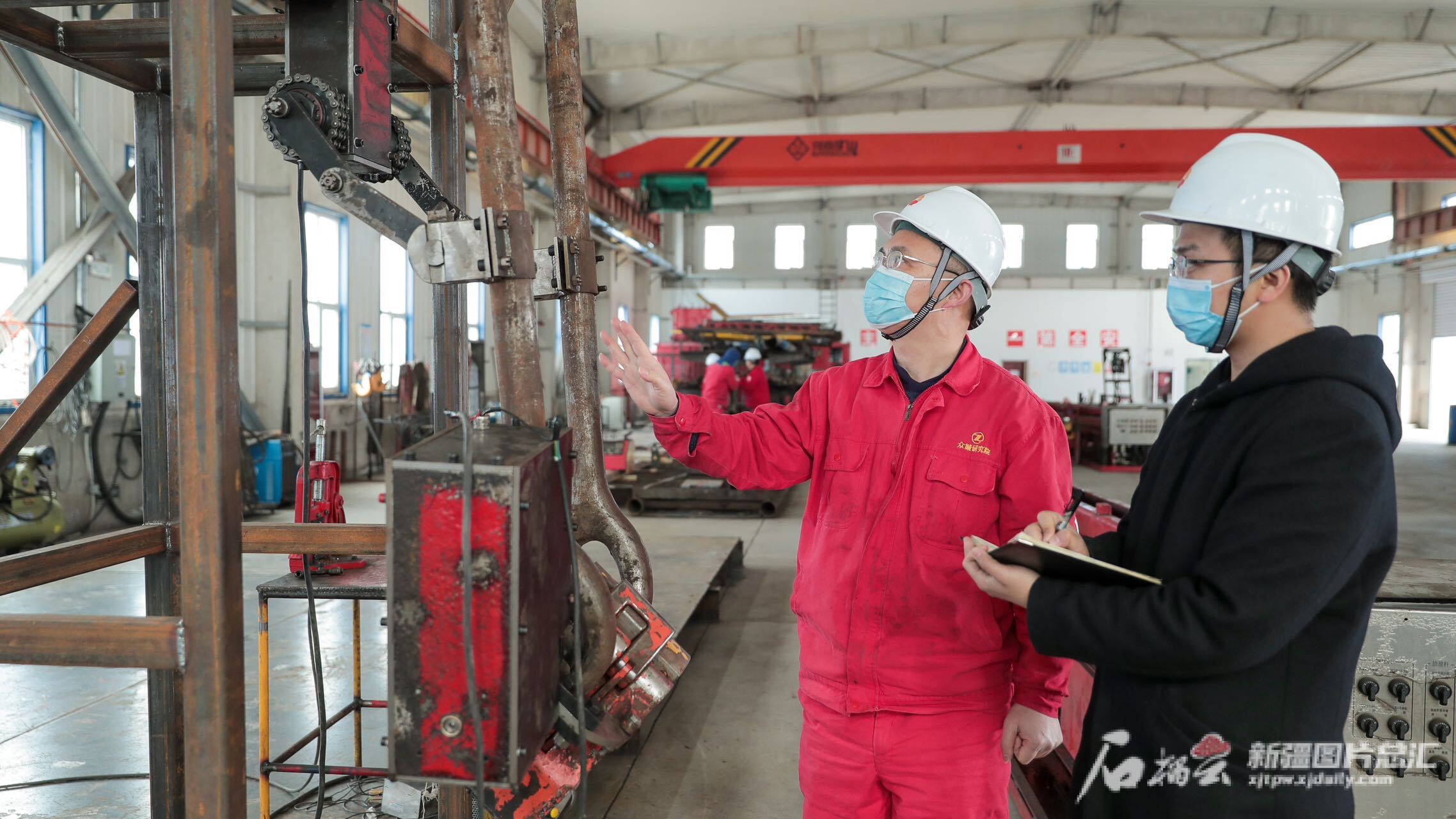 白碱滩区(克拉玛依高新区)科技局负责科技陪伴式服务的工作人员(右)在克拉玛依众城石油装备研究院股份有限公司交流辅导企业科技项目申报工作。钱旭东 摄
