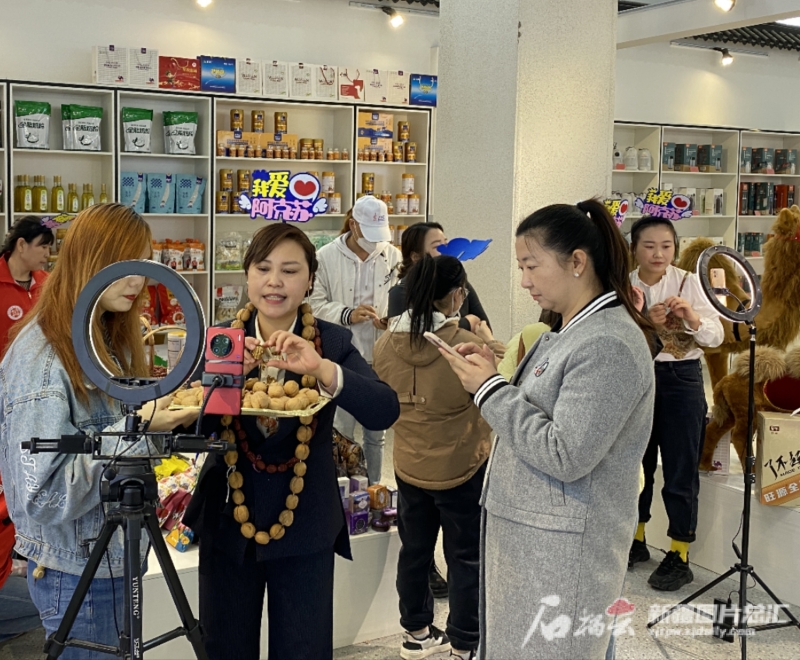 3月25日,“2023浙江精品·南疆优特产品展销会”在阿克苏轻工五金城举行,一些企业工作人员正在进行直播。梁佳妮摄