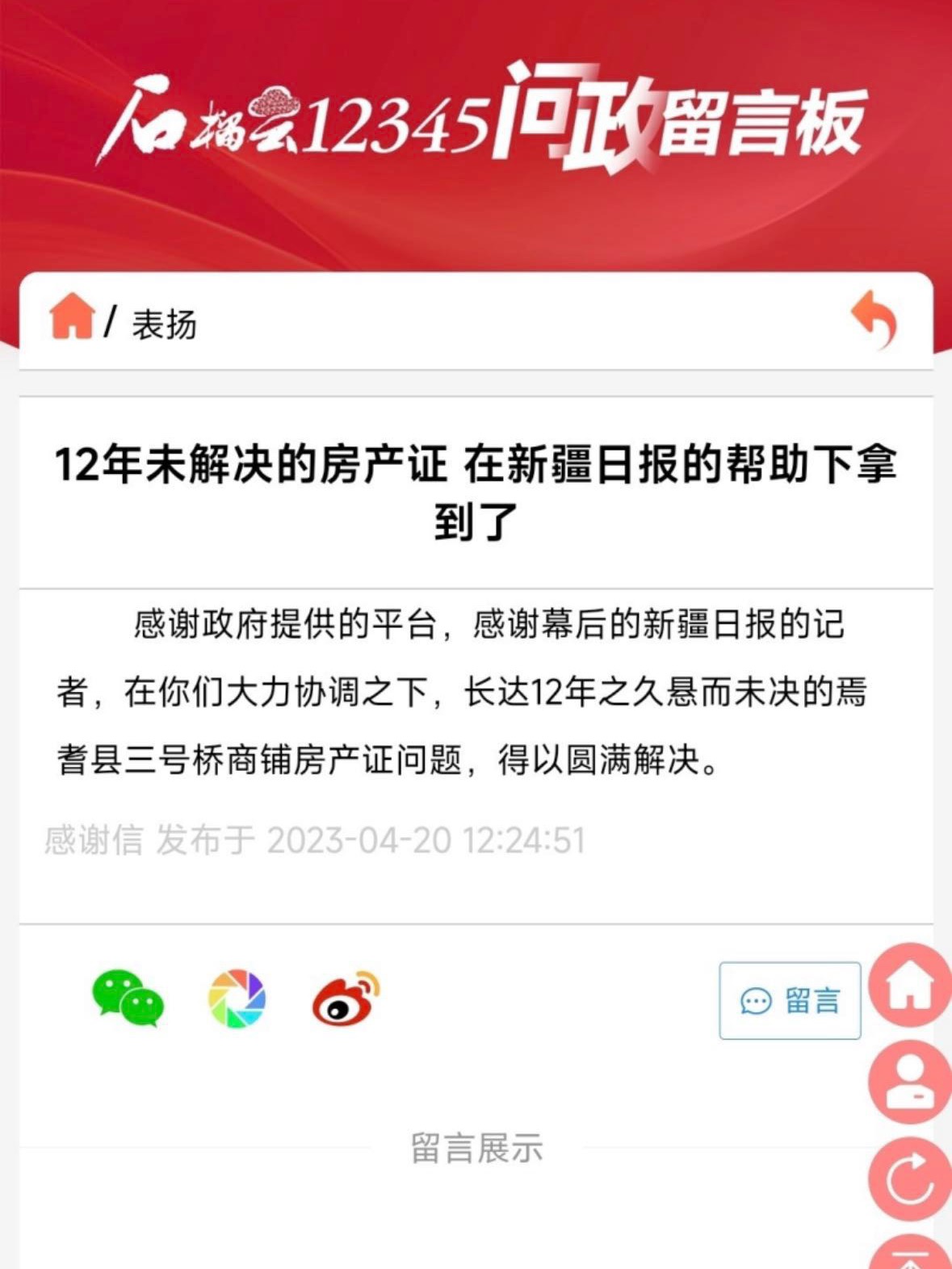 多年来,办理不动产权证是焉耆回族自治县三号桥商铺店主何先生的一块心病。得知“石榴云12345问政”留言板这一反映民意的渠道,他在留言板上反映诉求。“感谢党和政府提供的平台,感谢石榴云/新疆日报记者,有了大家耐心、细致的关注和推动,问题圆满解决了。”今年4月,何先生拿到了期盼12年之久的不动产权证后,在“石榴云12345问政”留言板上表达了自己的感激之情。