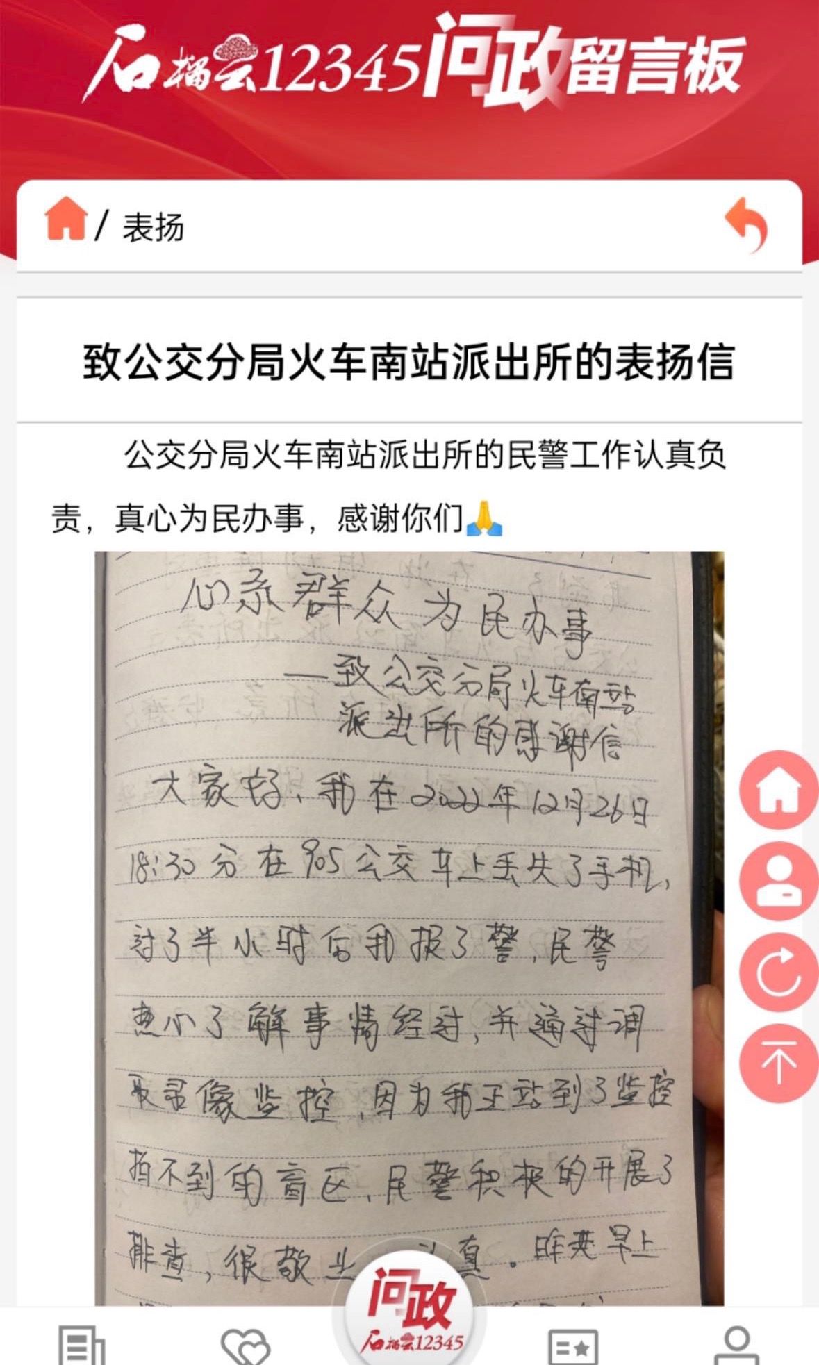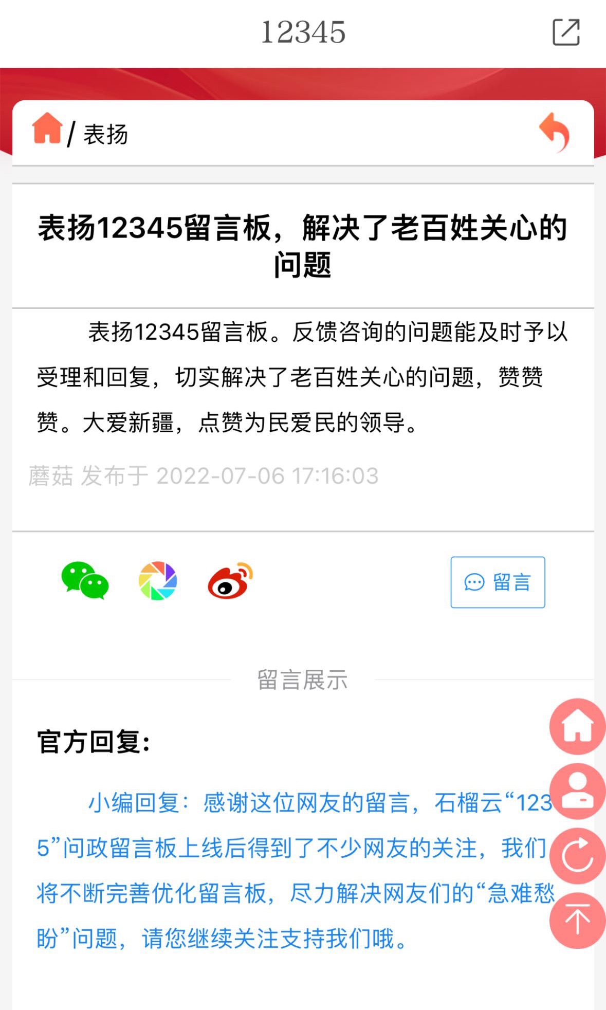 网友在“石榴云12345问政”留言板表扬专区留言截图。
