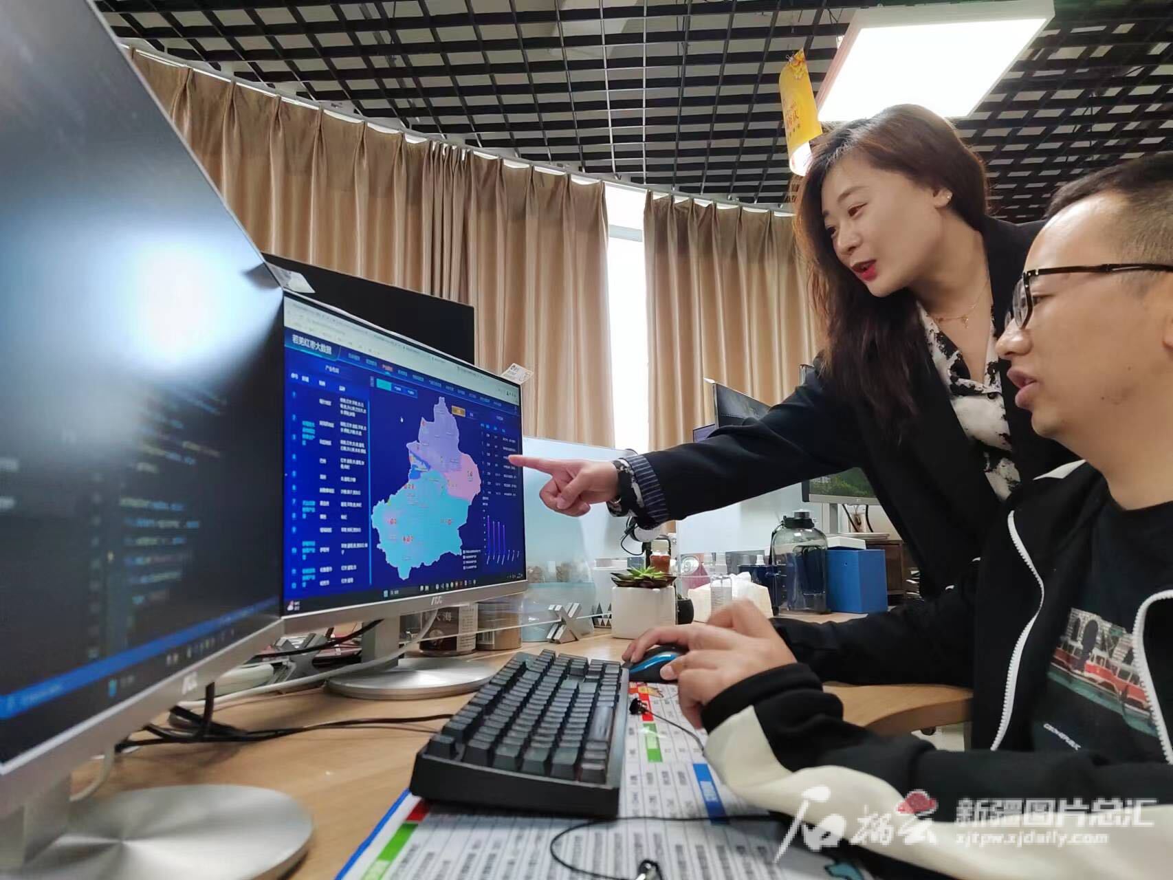 在克拉玛依云计算产业园的新疆七色花信息科技有限公司,工作人员正在查看系统数据 。石榴云/新疆日报记者 热依达摄