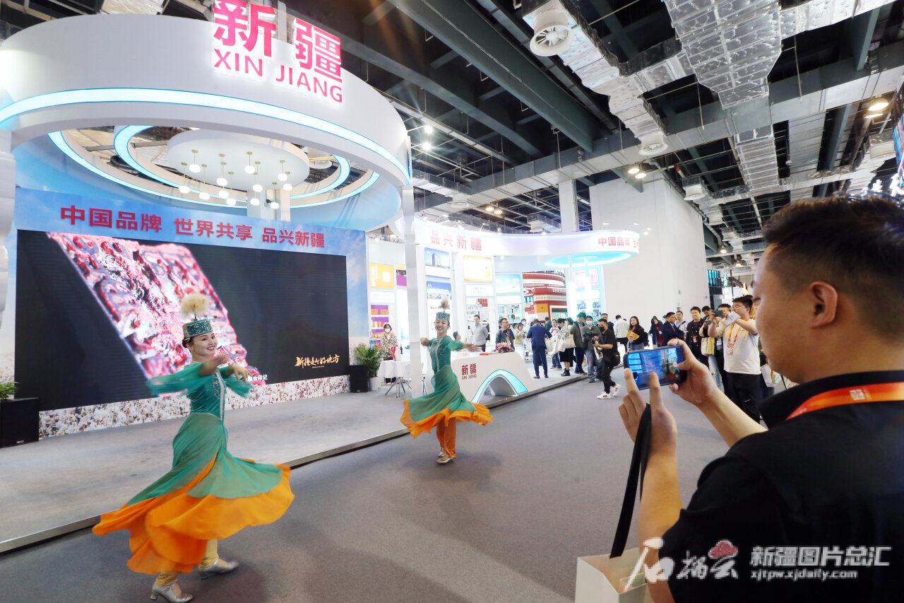 5月10日,2023年中国品牌日活动新疆展区,精彩的歌舞表演吸引了众多观众驻足观看。