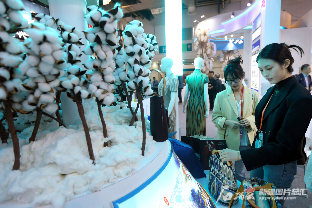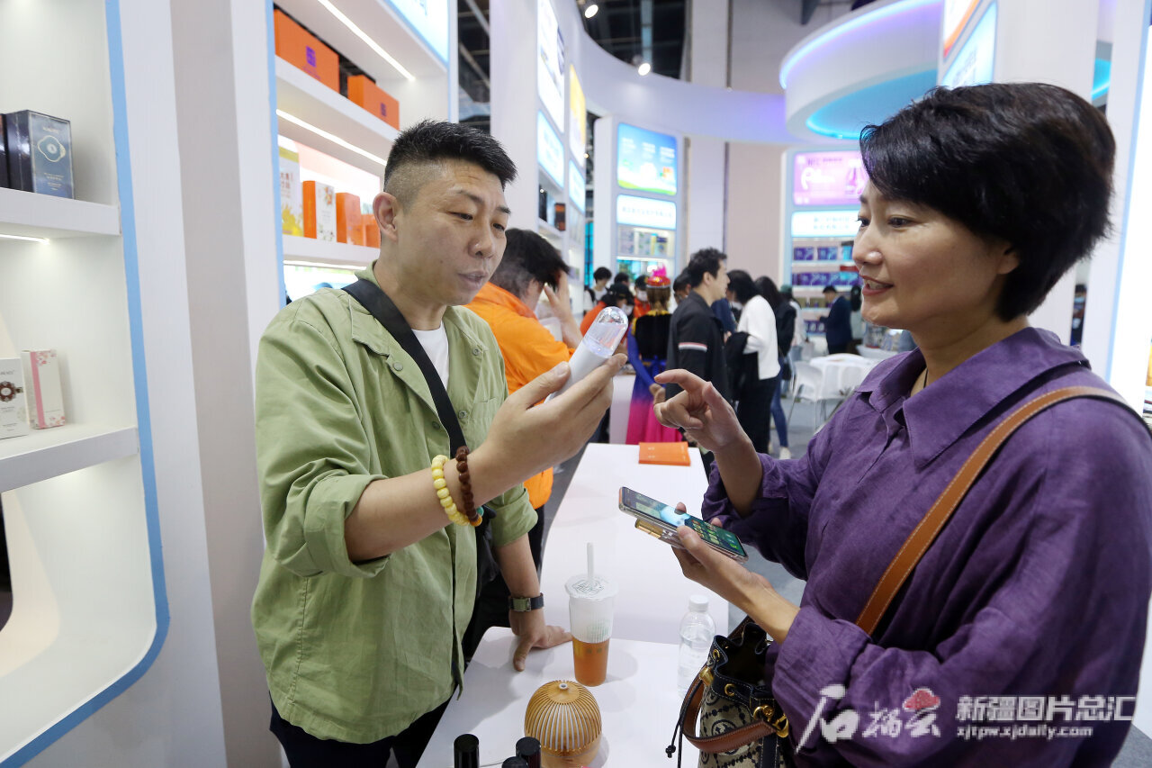5月10日,观众在乌鲁木齐丝路霓裳服饰文化有限公司展位了解产品。