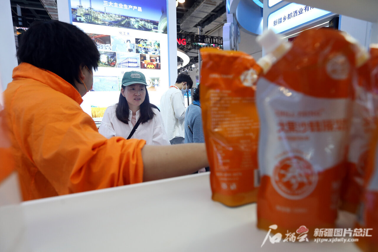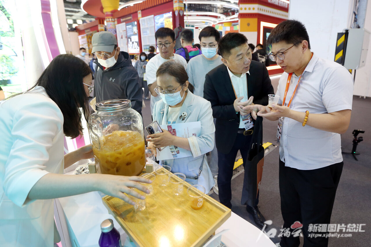 5月10日,观众在新疆康元生物技术集团股份有限公司展位上了解沙棘产品。