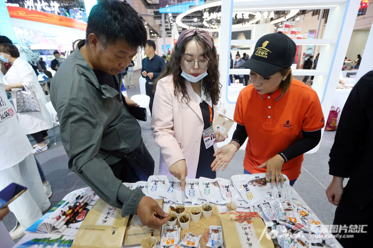 5月10日,观众在新疆天莱牧业集团有限责任公司展位上品尝牛肉干。