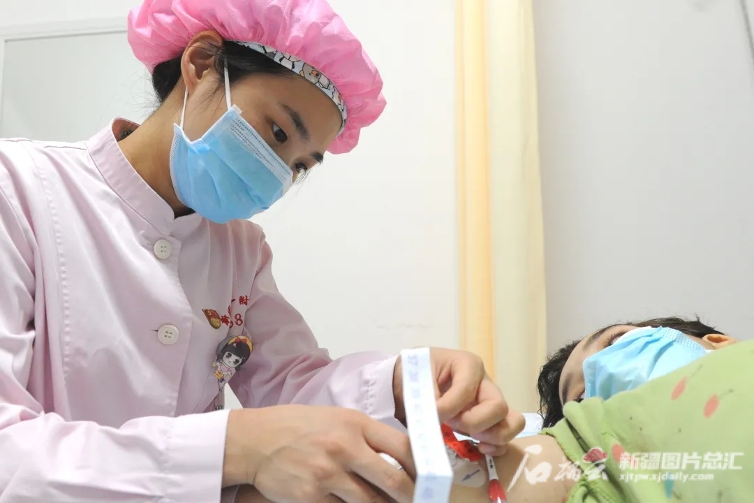新疆医科大学第一附属医院儿内一科护士为患儿进行经外周静脉穿刺中心静脉置管。新疆医科大学第一附属医院供图