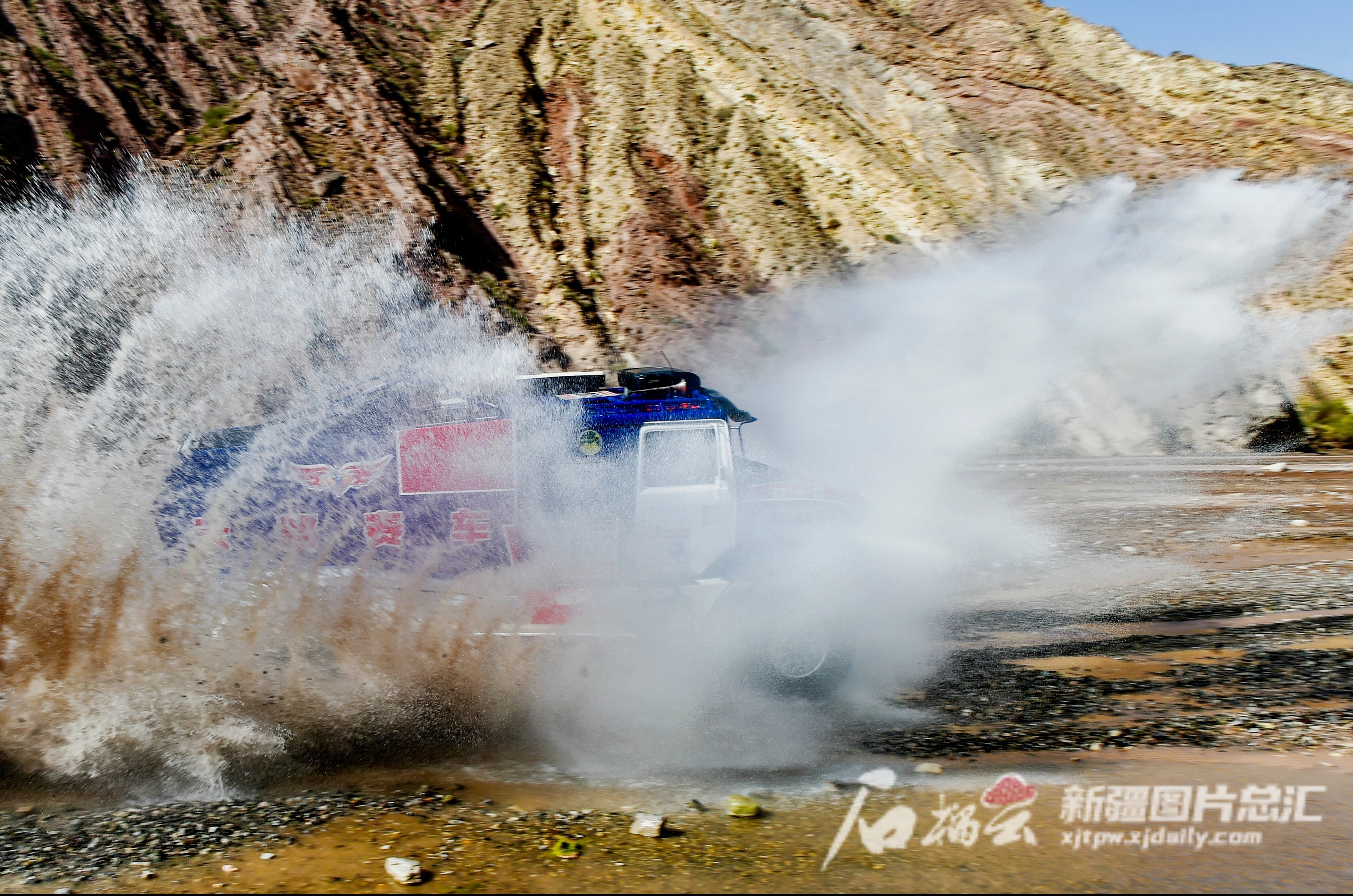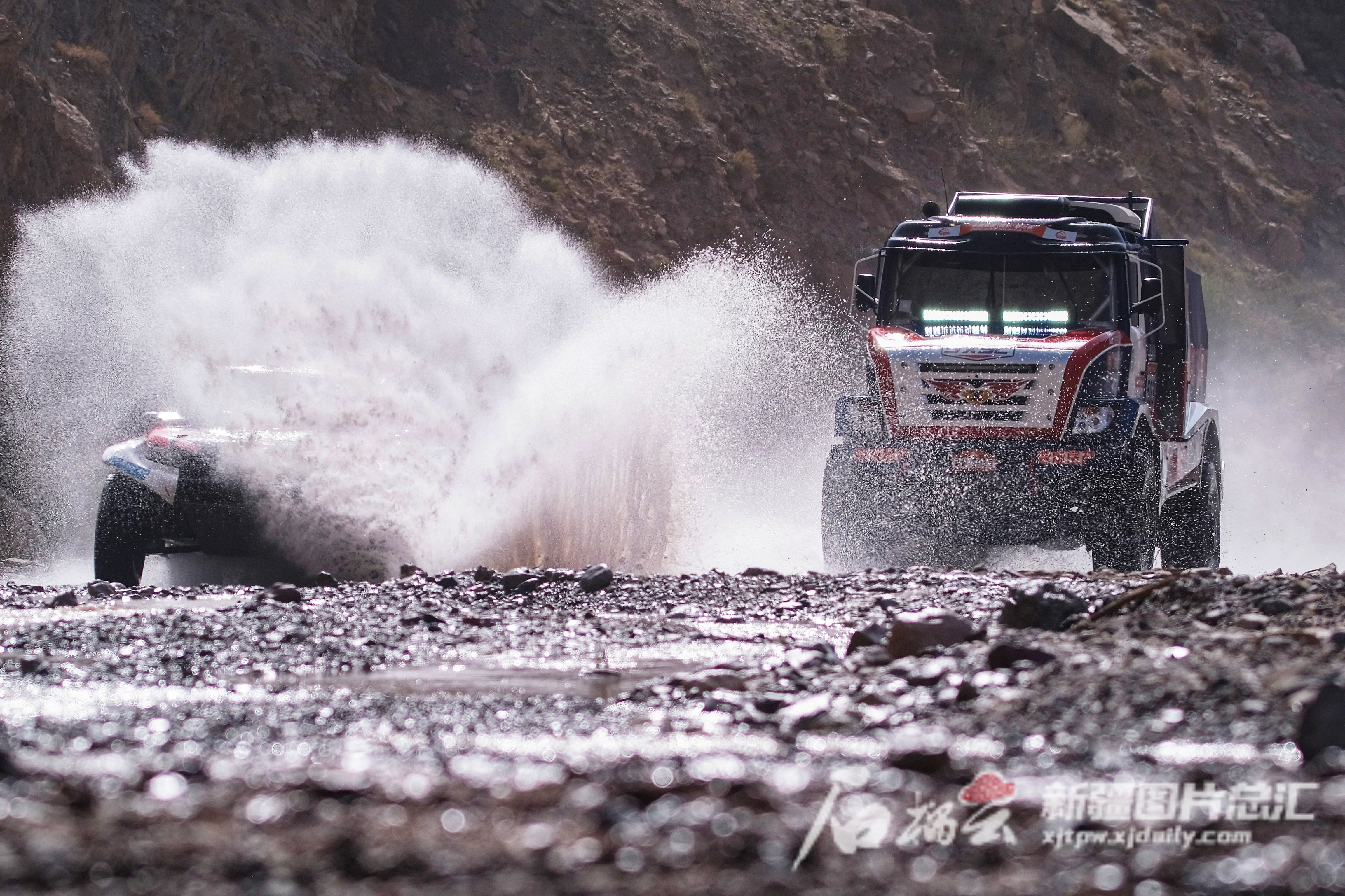 5月22日,一辆卡车组赛车在SS2柯坪赛段涉水行驶。石榴云/新疆日报记者 周鹏摄