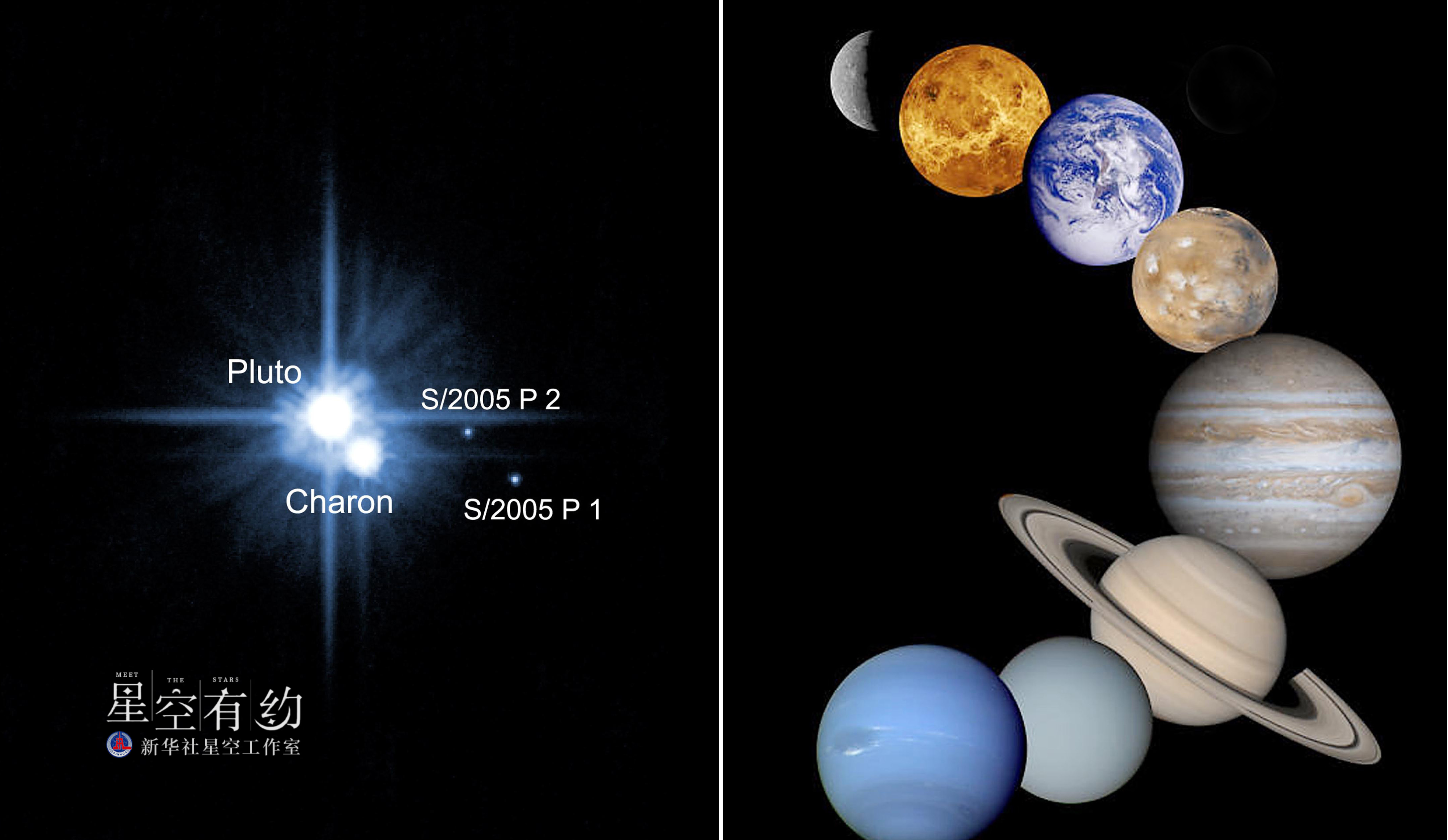 这张拼版照片的左图是美国航天局发布的2006年2月22日拍摄的冥王星(左上)、卡戎星(左下)及冥王星两颗卫星的照片。右图是美国航天局发布的水星、金星、地球、火星、木星、土星、天王星和海王星(从上至下)的合成照片。新华社发
