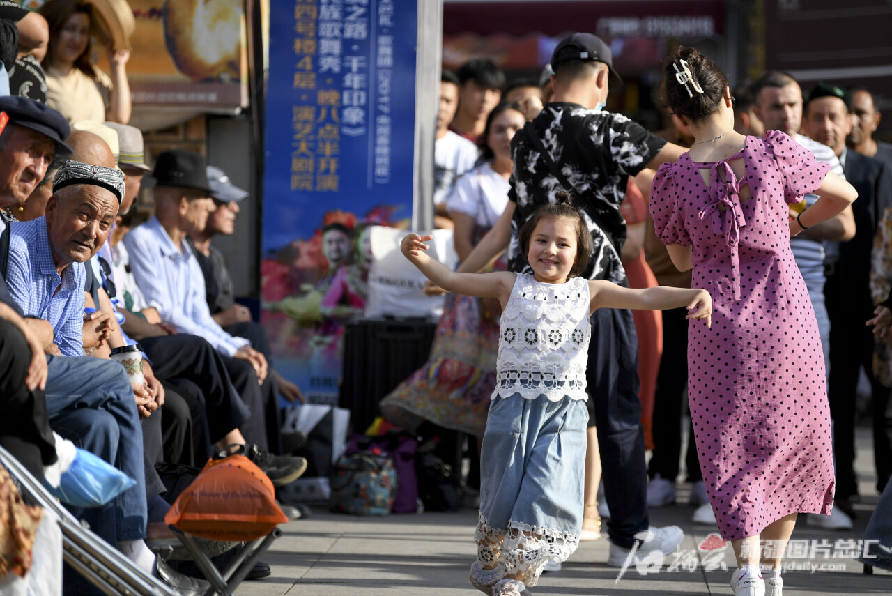 6月13日,小朋友在新疆国际大巴扎景区欢快地舞蹈。石榴云/新疆日报记者 汤永摄