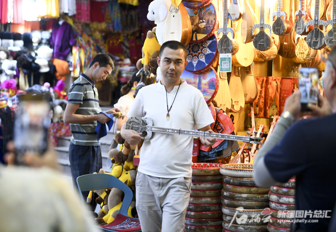 6月13日,游客在景区内拍摄乐器商人弹奏表演。石榴云/新疆日报记者 汤永摄
