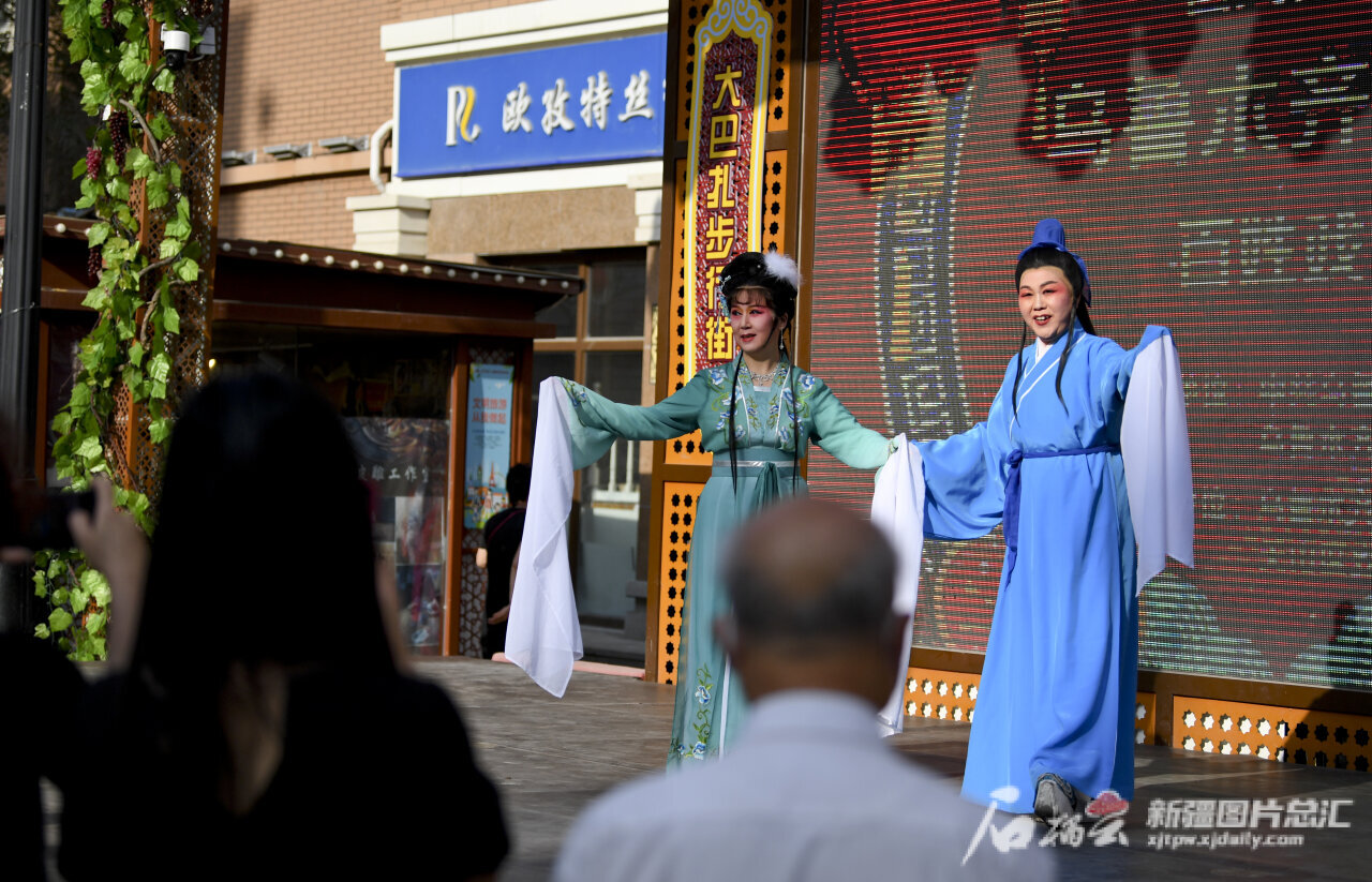 6月13日,演员在景区百姓戏曲大舞台表演戏曲。石榴云/新疆日报记者 汤永摄