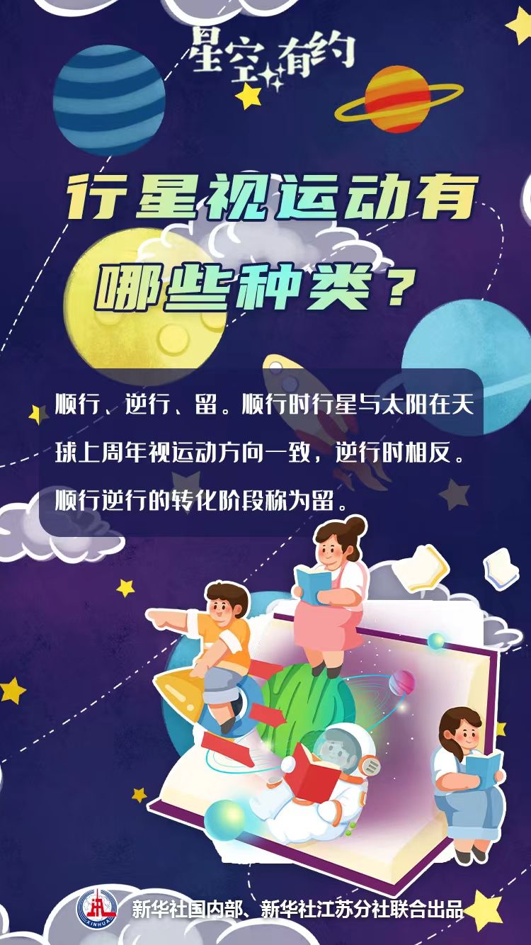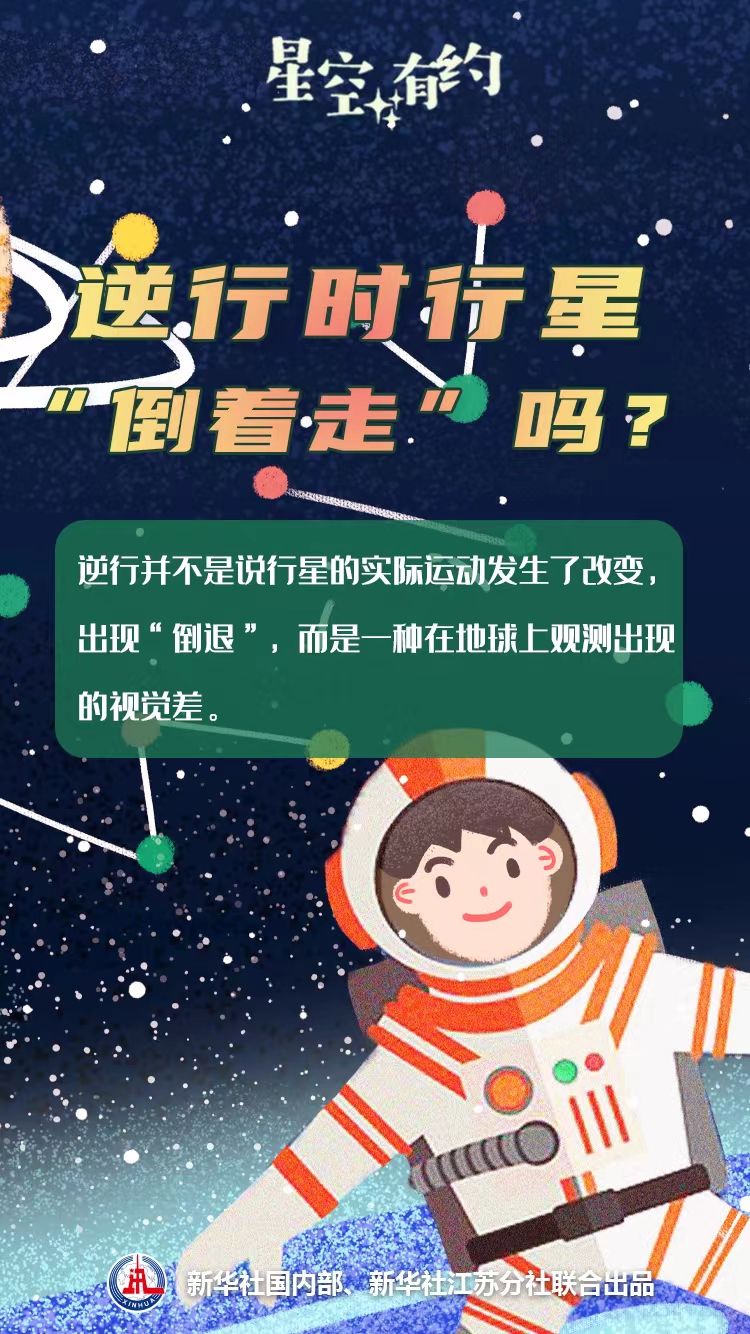 “逆行并不是说行星的实际运动发生了改变,出现‘倒退’,而是一种在地球上观测出现的视觉差。”王科超说,行星视运动分为三种:顺行、逆行、留。顺行时,行星在天球上的运动方向为自西向东,与太阳在天球上的周年视运动方向一致。逆行时,行星在天球上的运动方向为自东向西,与太阳在天球上的周年视运动方向相反。顺行逆行互相转换时,行星在天球上的位置短时期不动,称为留。